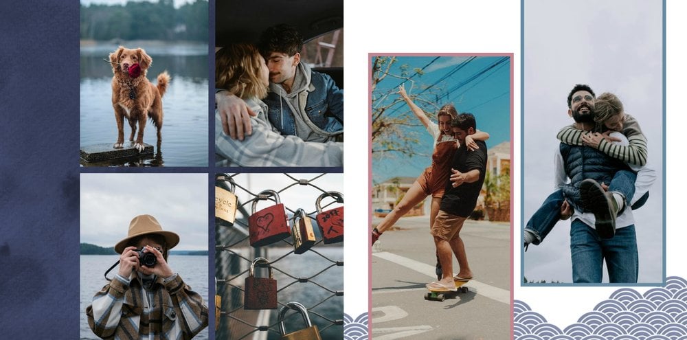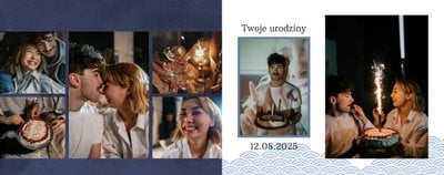 Z pomocą fotoksiążki "Prezent na rocznicę związku" wyrazisz swoje uczucia oraz na zawsze utrwalisz Wasze najpiękniejsze wspomnienia. Główny motyw kolorystyczny to ciemne, granatowe odcienie połączone z delikatną złamaną bielą i szarością. Szablon uzupełniają również pastelowe kolory dodane jako akcenty. Tak dobrana paleta kolorystyczna idealnie łączy się z marzycielskimi wzorami, dodając całości romantyczny wygląd.
