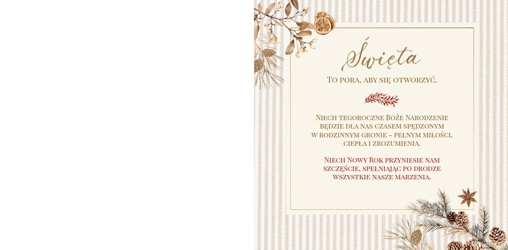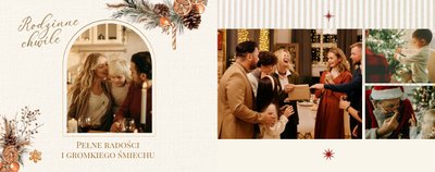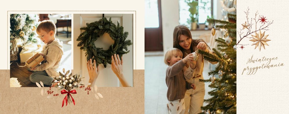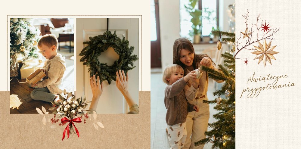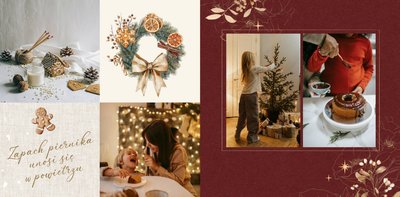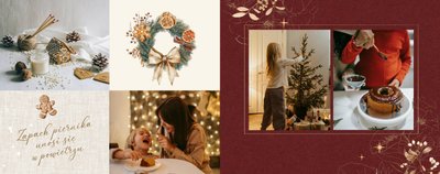 Fotoksiążka z szablonem "Prezent na Święta" to idealna propozycja jako prezent pod choinkę dla miłośników stylu boho. W środku znajdują się przepiękne, świąteczne ilustracje, nawiązujące swoim stylem do baśniowych ilustracji z książek. Alternatywą w tym szablonie świątecznym są kolory - beż, karmel, piernik oraz świąteczna czerwień. Wszystkie idealnie podkreślą każde rodzinne zdjęcia, a złote ramki wokół dodadzą im jeszcze bardziej odświętny wygląd.