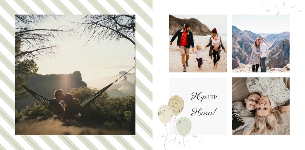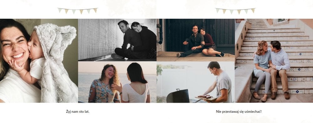 Uniwersalna forma szablonu “Prezent na urodziny” pozwoli stworzyć Ci w pełni spersonalizowany projekt. Na każdej stronie możesz dodać życzenia czy wzruszające cytaty, a wielkość komórek zdjęciowych i elementy na stronie dostosować do własnych potrzeb.