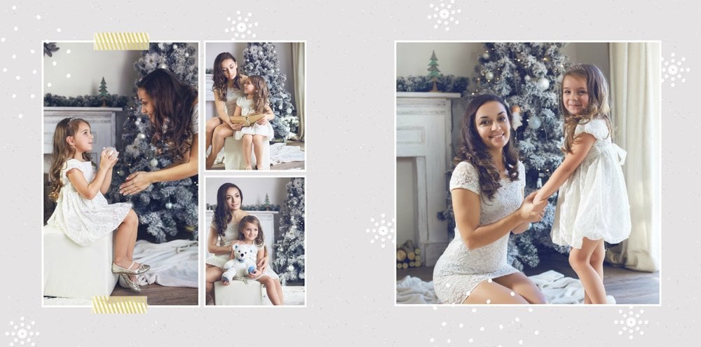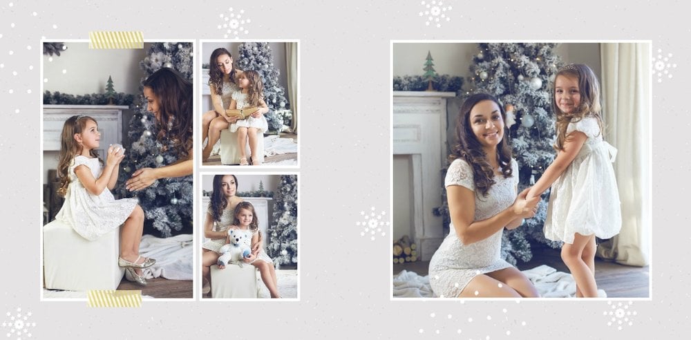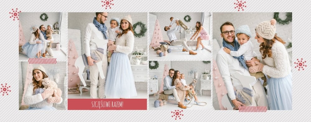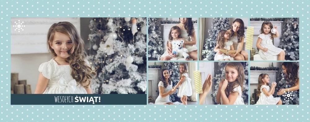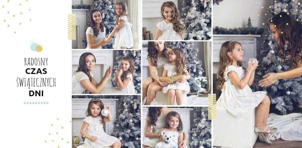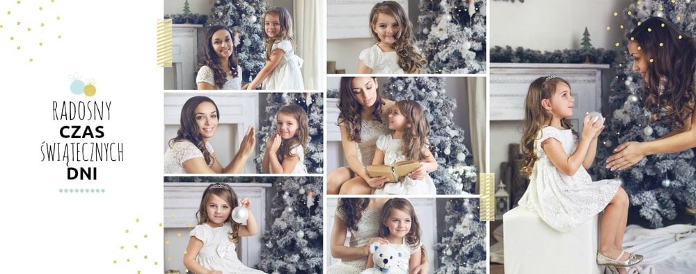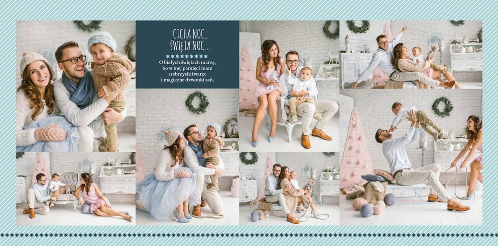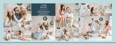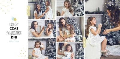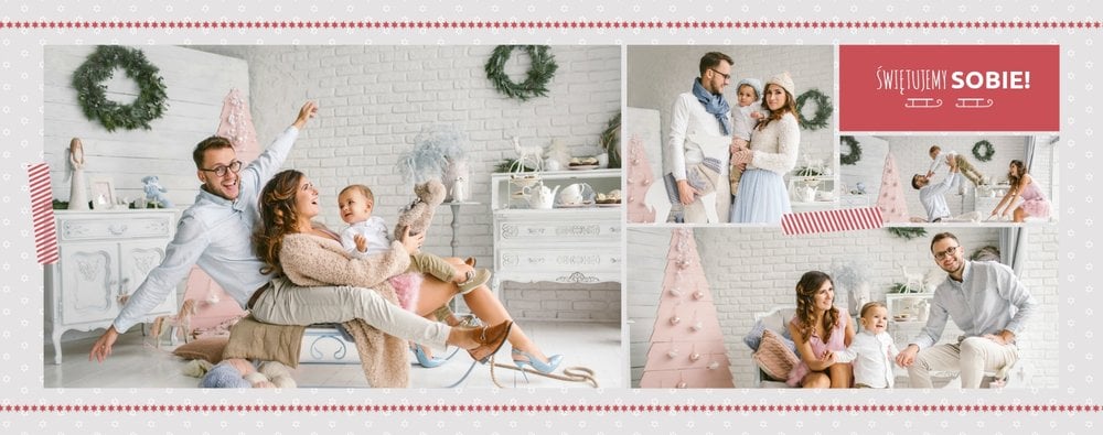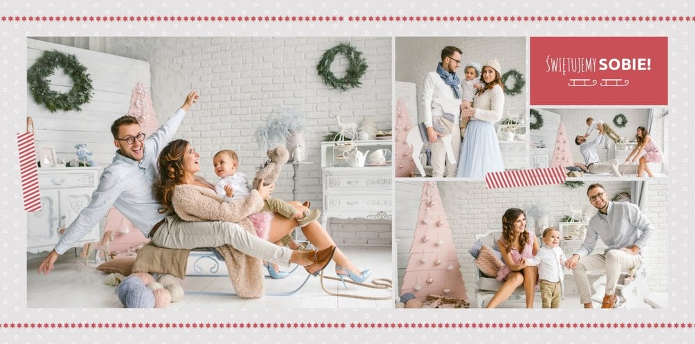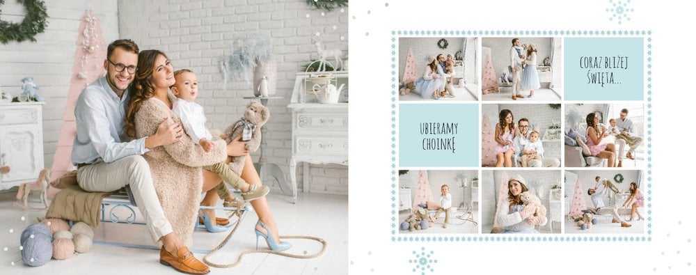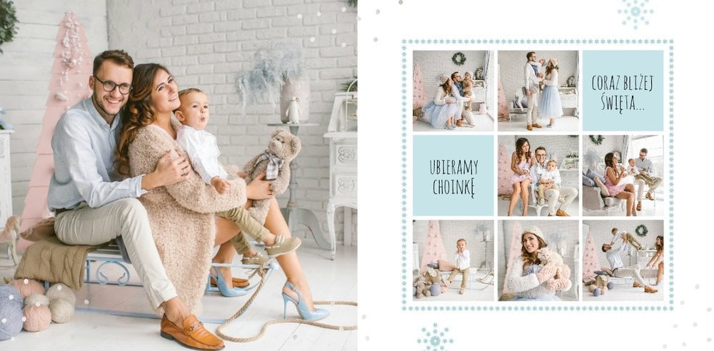 Fotoksiążka z szablonem Święta na 102 stanie się idealnym prezentem dla bliskich. Stonowane tła z kolorowymi akcentami, bożonarodzeniowa grafika i świąteczne teksty, które można swobodnie modyfikować, świetnie oddadzą świąteczny klimat. Podaruj ukochanym osobom piękne wspomnienia w postaci fotoksiążek.
