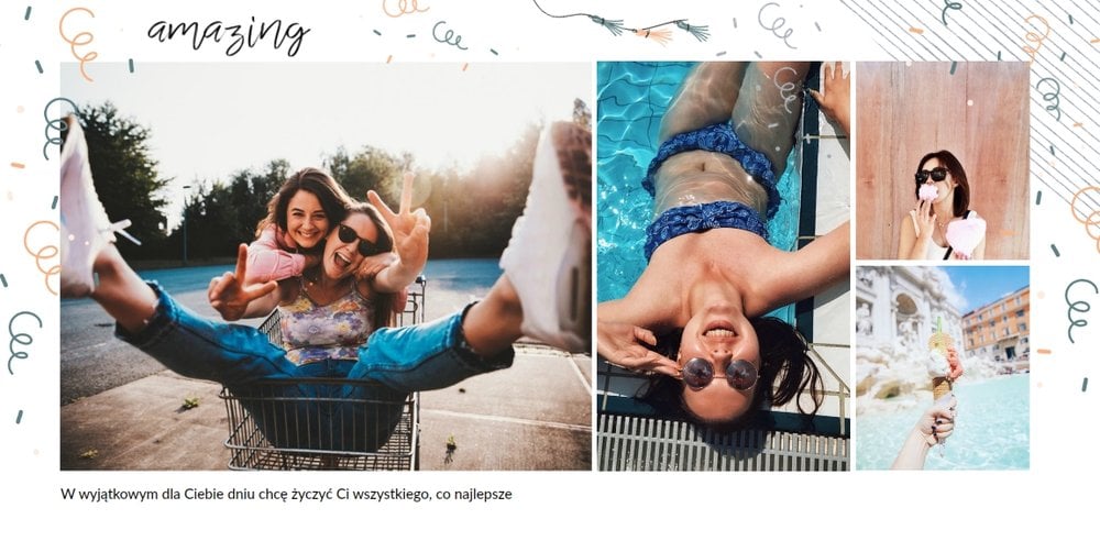 Z szablonem Prezent urodzinowy, zaprojektujesz piękną pamiątkę urodzinową dla najbliższej Ci osoby. Oryginalna grafika, mnóstwo miejsc na urodzinowe życzenia sprawią, że fotoksiążka z tym szablonem będzie idealnym źródłem wspomnień przez wiele, wiele lat. Zbierz najlepsze zdjęcia i zaprojektuj piękny Prezent urodzinowy!