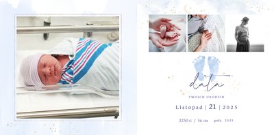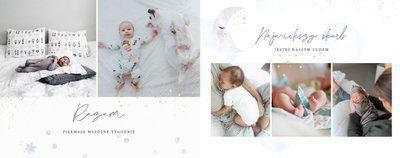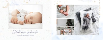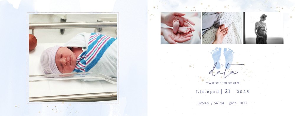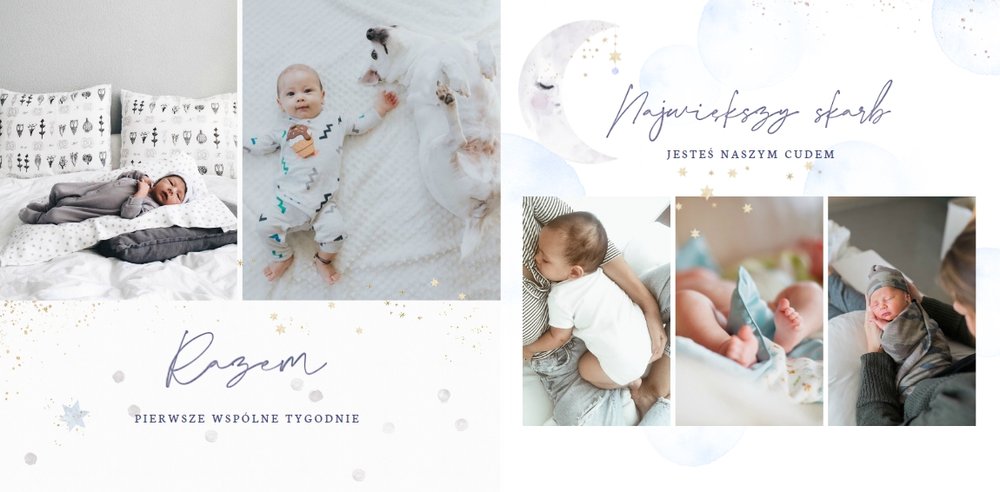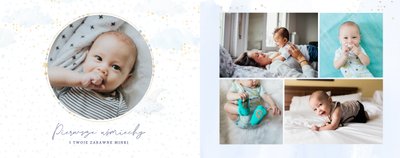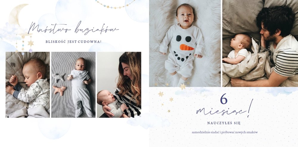 Z szablonem "Roczek synka" ten rok będzie wiecznie żywy. Umieszczone zdjęcia dodadzą całości uroku i wypełnią wnętrze minimalistycznej fotoksiążki. Pełne bieli strony wzbogacone są o błękitne elementy graficzne. Ciekawe układy pozwolą Ci umieścić całą masę zdjęć i dodać najważniejsze informacje - takie jak wzrost i waga.
