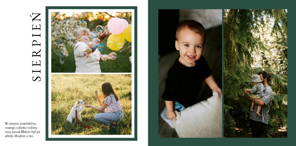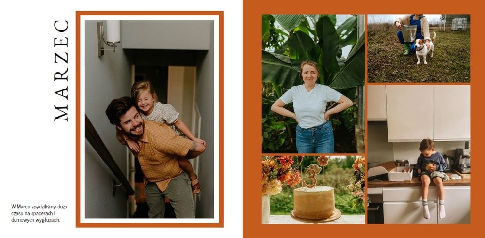 Szablon stworzony jest w minimalistycznym stylu - prosto i funkcjonalnie rozmieszczone zdjęcia na stronach projektu wprowadzają harmonię i ułatwiają wykonanie pamiątki. Dodatkowo, na każdej rozkładówce głównym motywem przewodnim jest kolor, który możesz dopasować według swoich upodobań. Podsumuj najważniejsze wydarzenia roku na specjalnych stronach fotoksiążki, przeznaczonych do ich upamiętnienia poprzez zdjęcie i podpis. Na każdej stronie znajdziesz również wyznaczone miejsce na krótkie podsumowanie miesiąca, aby móc zawsze wracać do tych pięknych chwil nie tylko poprzez zdjęcia, ale również słowa.