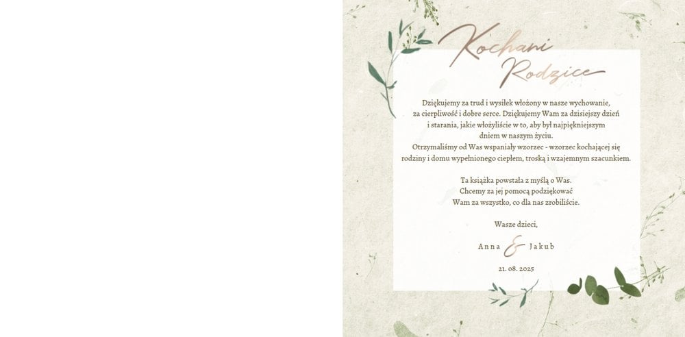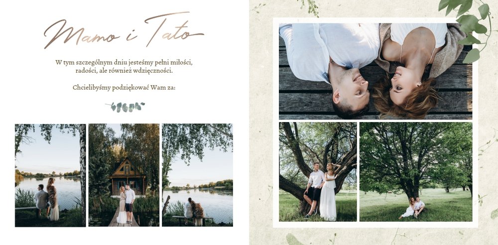 Rustykalne podziękowania dla Rodziców to kolejna część rustykalnej serii szablonów. Fotoksiążka z tym szablonem to odwzorowanie natury i minimalizmu - a to wszystko zamknięte wewnątrz oryginalnego projektu. Szablon pozwoli Ci w nietypowy sposób wyrazić wdzięczność i miłość do ukochanych Rodziców. Natomiast wnętrze zapewnia mnóstwo miejsca na wspomnienia z dziecięcych lat, a także na aktualne zdjęcia - na przykład z Waszej narzeczeńskiej sesji. Fotoksiążka z szablonem Rustykalne podziękowania dla Rodziców zawiera białe strony, które upiększone są złotymi napisami graficznymi i roślinnymi grafikami. Tak przygotowana fotoksiążka to idealna propozycja na prezent dla Rodziców w tak szczególnym dniu.