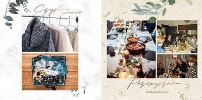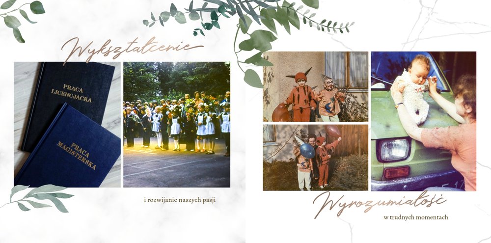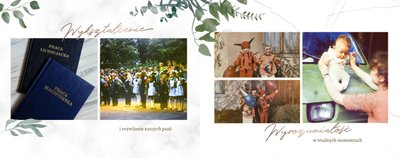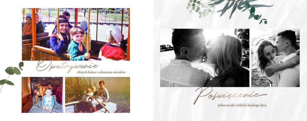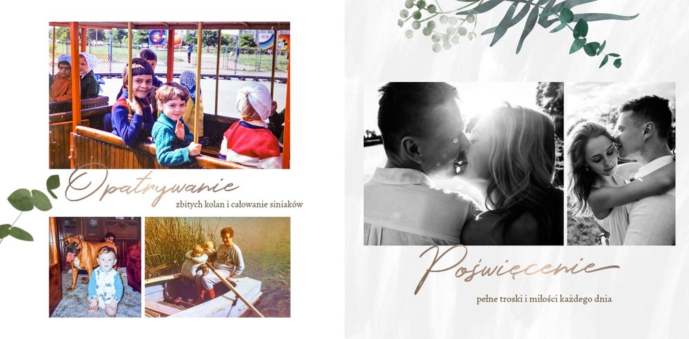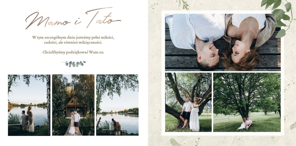 Rustykalne podziękowania dla Rodziców to kolejna część rustykalnej serii szablonów. Fotoksiążka z tym szablonem to odwzorowanie natury i minimalizmu - a to wszystko zamknięte wewnątrz oryginalnego projektu. Szablon pozwoli Ci w nietypowy sposób wyrazić wdzięczność i miłość do ukochanych Rodziców. Natomiast wnętrze zapewnia mnóstwo miejsca na wspomnienia z dziecięcych lat, a także na aktualne zdjęcia - na przykład z Waszej narzeczeńskiej sesji. Fotoksiążka z szablonem Rustykalne podziękowania dla Rodziców zawiera białe strony, które upiększone są złotymi napisami graficznymi i roślinnymi grafikami. Tak przygotowana fotoksiążka to idealna propozycja na prezent dla Rodziców w tak szczególnym dniu.
