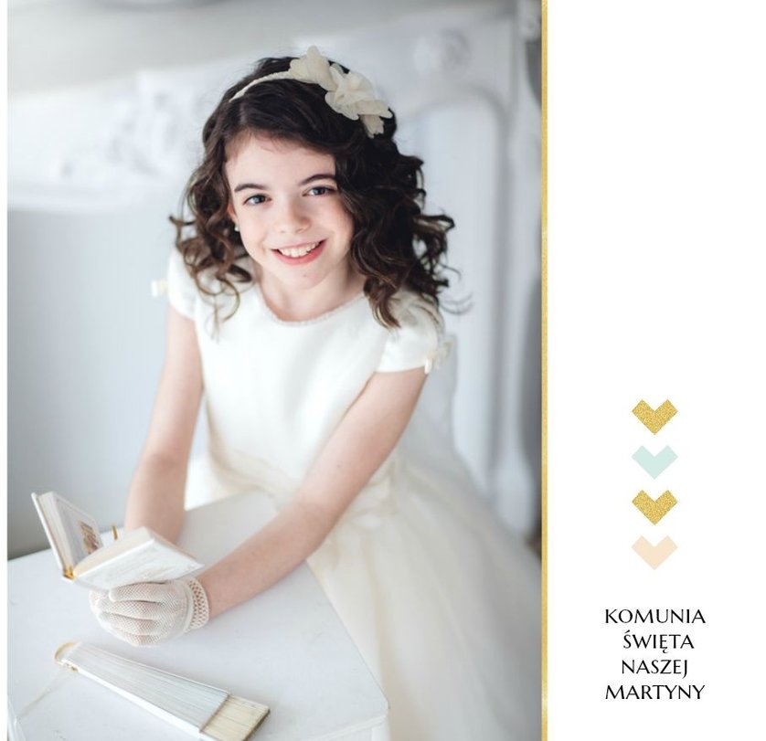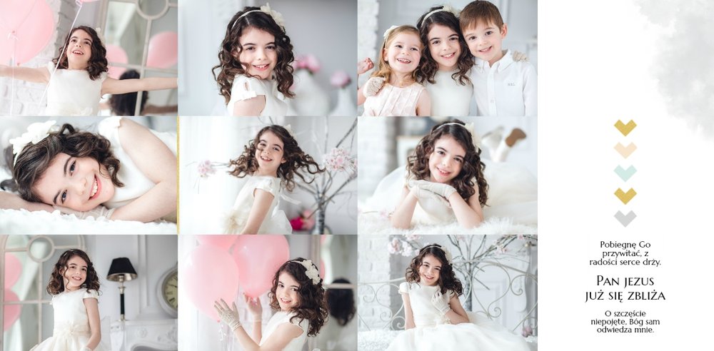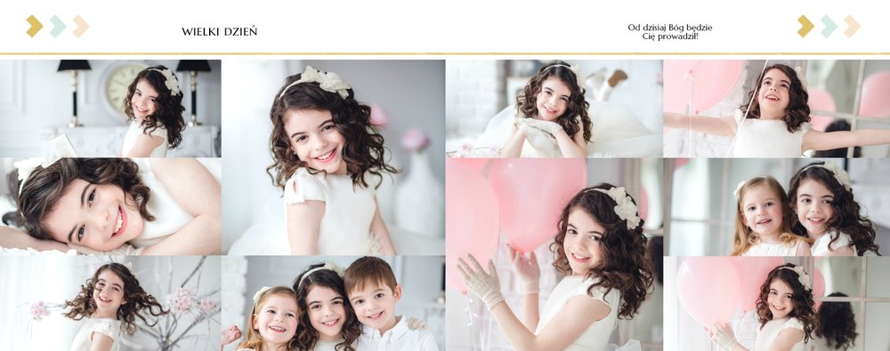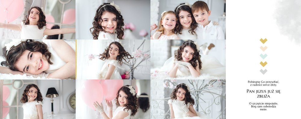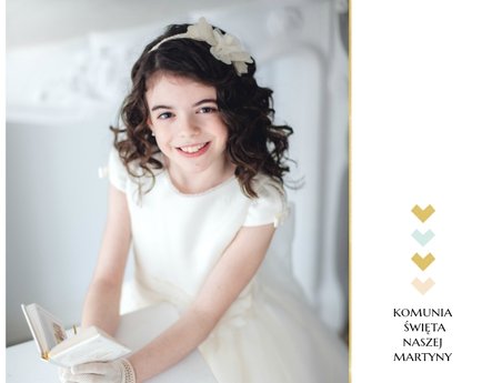 Przyjęcie sakramentu Komunii Świętej to wydarzenie, które dotyczy całej rodziny. Przygotuj fotoksiążkę, w której w oryginalny sposób podsumujesz ten ważny dla Twojego dziecka dzień. Zaprojektowana pamiątka będzie idealnym pomysłem na prezent dla kochanych dziadków, czy rodziców chrzestnych. Szablon Sakrament Komunii Świętej umożliwi Ci dodanie najważniejszych informacji, cytatów oraz pozwoli umieścić zdjęcia w specjalnych ramkach. Całość idealnie dopełniają złote elementy i pastelowe dodatki graficzne.