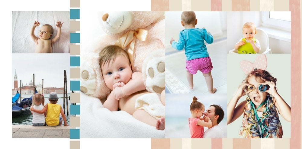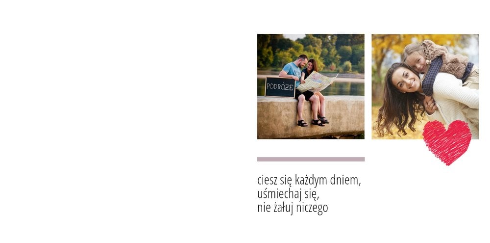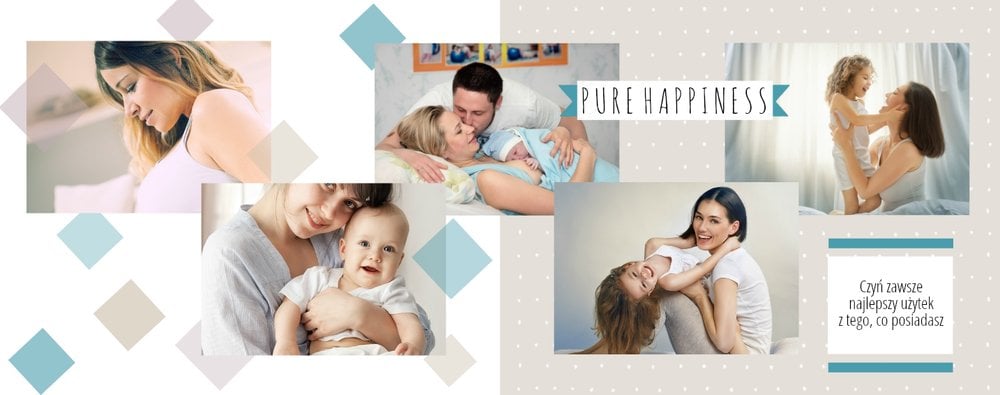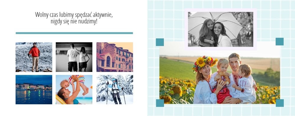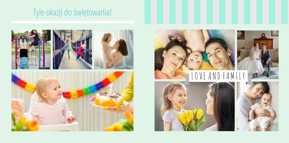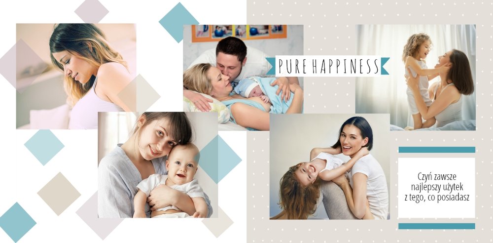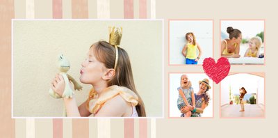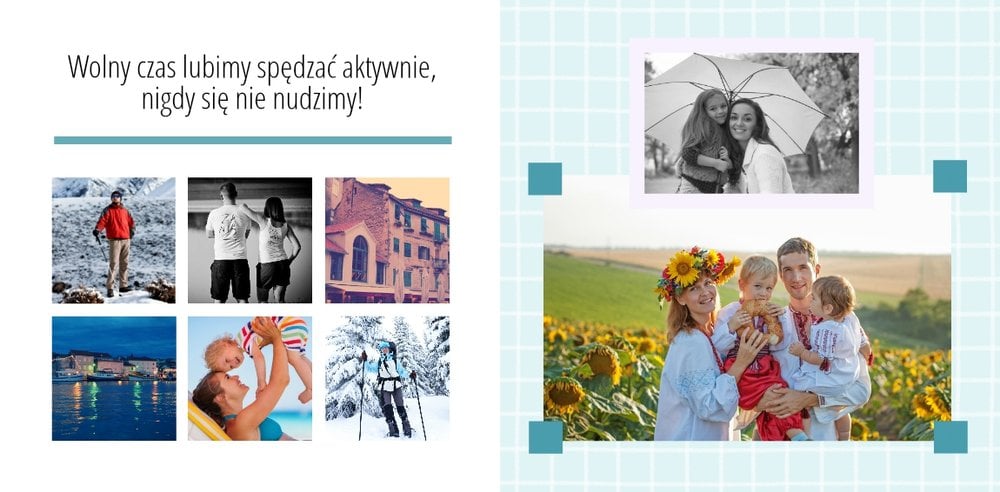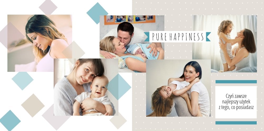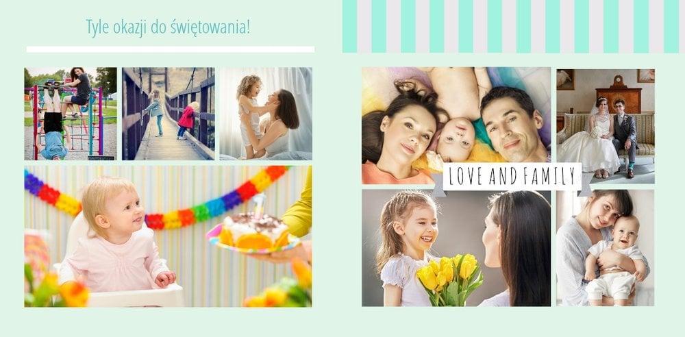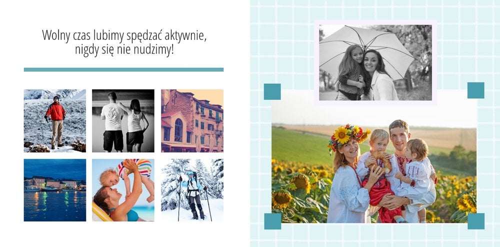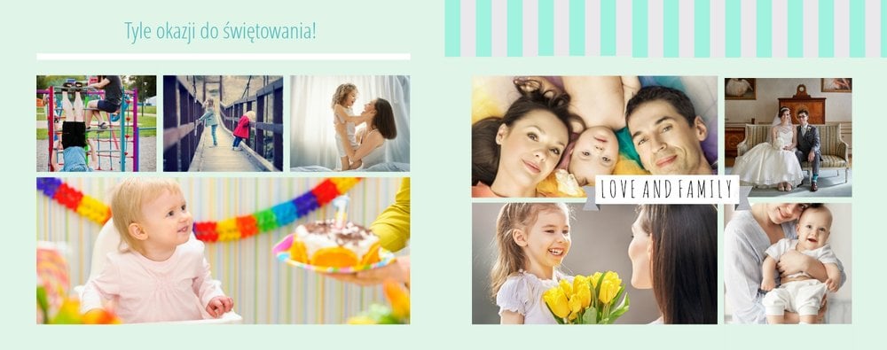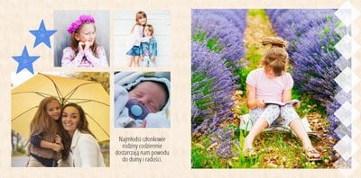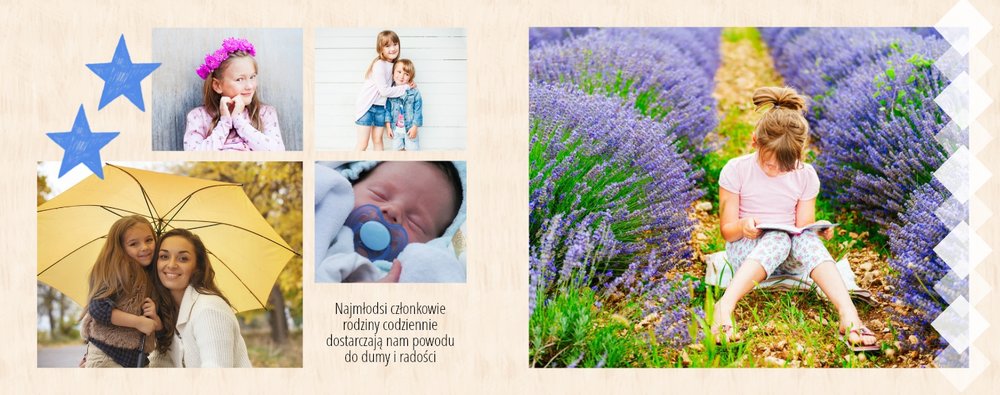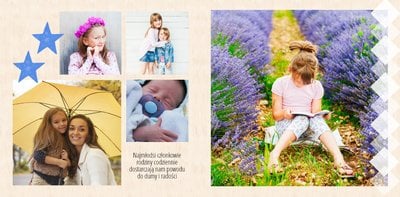 Szablon Sesja dziecięca to idealne miejsce na piękne, rodzinne wspomnienia. Wybierz ulubione zdjęcia i zaprojektuj fotoksiążkę, do której z przyjemnością będą wracać wszyscy członkowie rodziny. Znajdziesz w nim jasne, pastelowe tła i delikatne dodatki. Szablon typu "everyday life", nadaje się na wiele okazji. Strony możesz dowolnie modyfikować, aby stworzyć spersonalizowaną fotoksiążkę.