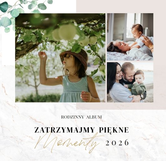 Szablon "Skarby naszej rodziny" nawiązuje do motywu rustykalnego, jednak fotoksiążka uzupełniona jest także o marmurowe strony, ozdobione pozłacanymi elementami graficznymi. Całość dopełniają dwie czcionki: delikatna pisana czcionka oraz nieco mocniejsza czarna, dzięki którym wyrazisz głęboko skrywane uczucia.