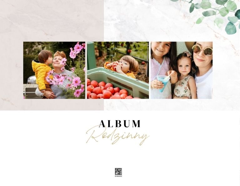 Szablon "Skarby naszej rodziny" nawiązuje do motywu rustykalnego, jednak fotoksiążka uzupełniona jest także o marmurowe strony, ozdobione pozłacanymi elementami graficznymi. Całość dopełniają dwie czcionki: delikatna pisana czcionka oraz nieco mocniejsza czarna, dzięki którym wyrazisz głęboko skrywane uczucia.