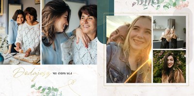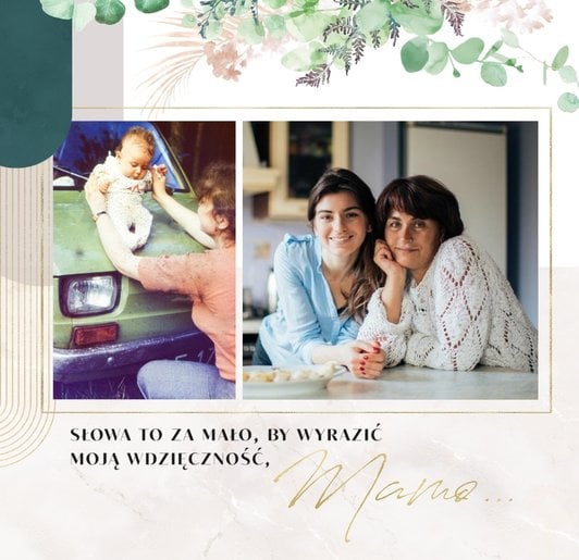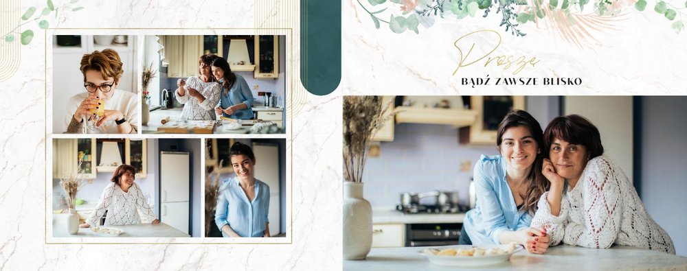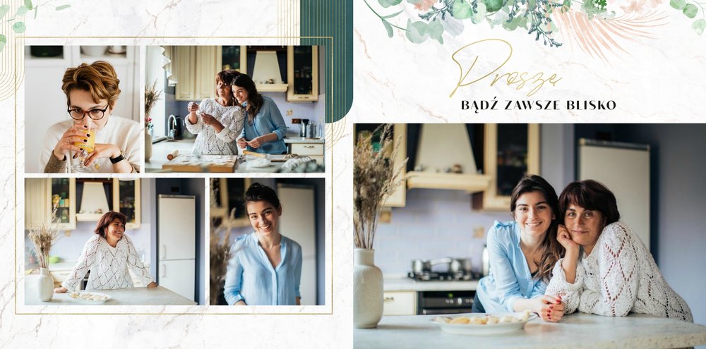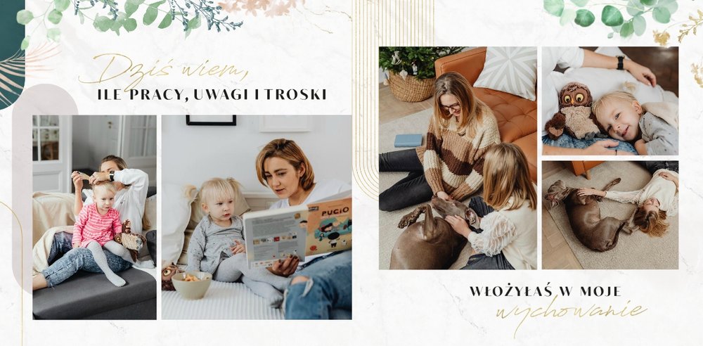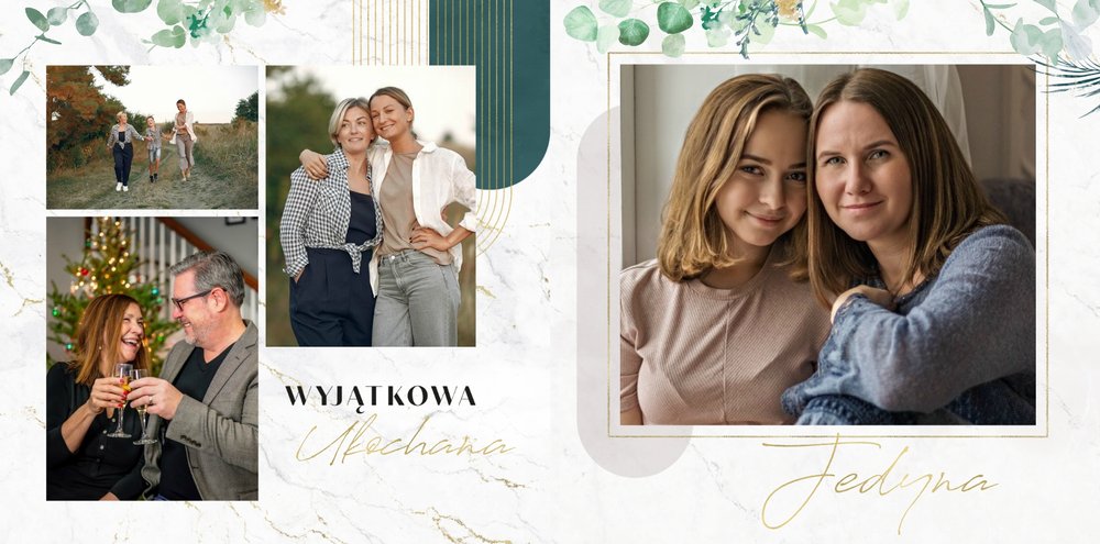Fotoksiążka z szablonem "Słowa to za mało" to wyjątkowa forma okazania uczuć ukochanej Mamie. W szablonie zostały ujęte życzenia, sentencje i krótkie zdania, wyrażające miłość i podziękę. Po uzupełnieniu komórek zdjęciowych, tekstom towarzyszyć będą Wasze wspólne fotografie od najmłodszych lat, które z pewnością wywołają u Mamy wzruszenie. Całość zdobią delikatne marmurowe tła, złote ornamenty, kwiaty oraz liście eukaliptusa.