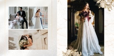 Szablon "Ślub glamour" to połączenie wyrafinowanej elegancji z odrobiną błysku i klasycznego luksusu. Jest idealną propozycją dla wszystkich młodych par chcących uwiecznić swoje wspomnienia ze ślubu w stylu glamour. Głównym motywem przewodnim są metaliczne kolory, które królują na wszystkich stronach szablonu. Cienkie i eleganckie ramki, pióra, kompozycje kwiatowe oraz inne dodatki graficzne zostały utworzone w trzech wariantach kolorystycznych, skupiających się wokół złota, srebra i rose gold. Całość uzupełniają delikatne tła w motywie satyny i marmuru, które podkreślą szyk każdego zdjęcia