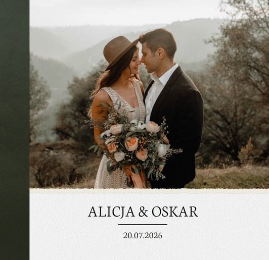 Fotoksiążka sprawdzi się zarówno dla fotografii ślubnych w klimacie mniej jak i bardziej tradycyjnych wesel. To minimalistyczna propozycja dla wszystkich młodych par kochających połączenie delikatnej elegancji i natury. Neutralne kolory ziemi - szałwia, zieleń, beż i brąz - podkreślą zdjęcia robione zarówno w plenerze, jak i na pięknie zdobionej sali. Elegancji dodadzą im delikatne, białe ramki.