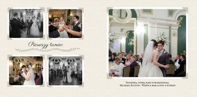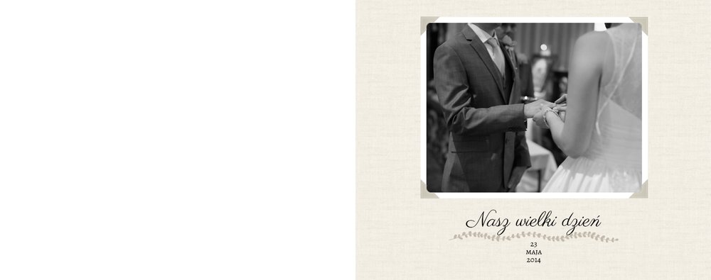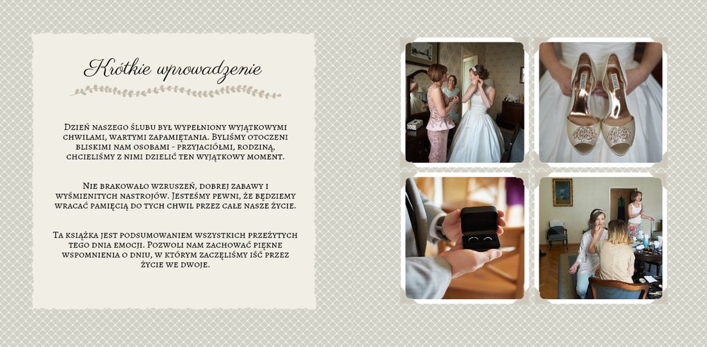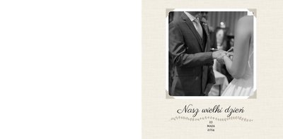 Marzenia się spełniają. Wasz Najważniejszy Dzień na wspólnej drodze życia, wymagał wiele pracy i zaanagażowania. Upamiętni je album na zdjęcia ślubne. Szablon “Ślub Marzeń” utrzymany jest w rustykalnym stylu. Strony mają odcienie ciepłego beżu, na tle delikatnych ornamentów i białych ramek. Czarna ozdobna czcionka współgra z grafiką fotoksiążki. Wasze zdjęcia ślubne zyskają z tym szablonem delikatną i sentymentalną oprawę. Fotoksiążka “Ślub Marzeń” to ponadczasowa pamiątka ślubna dla rodziców, gości weselnych i Państwa Młodych.
