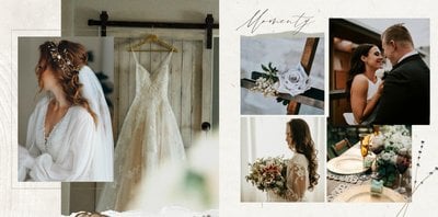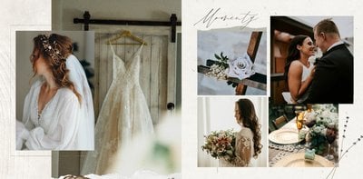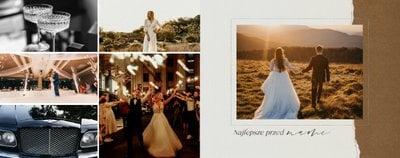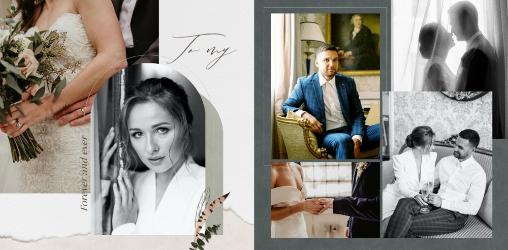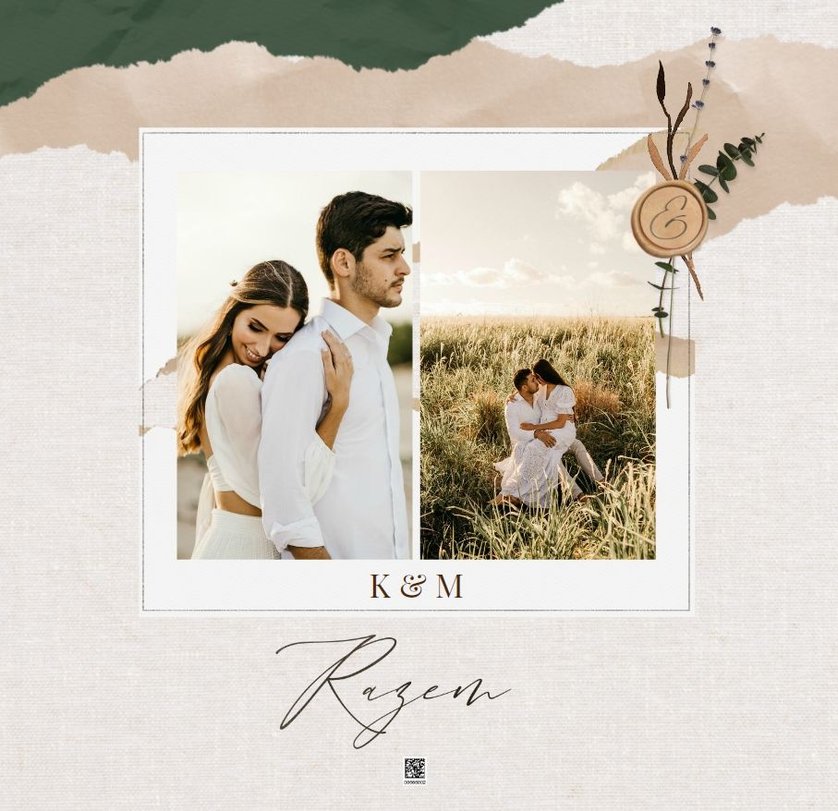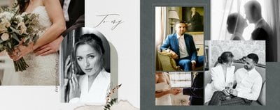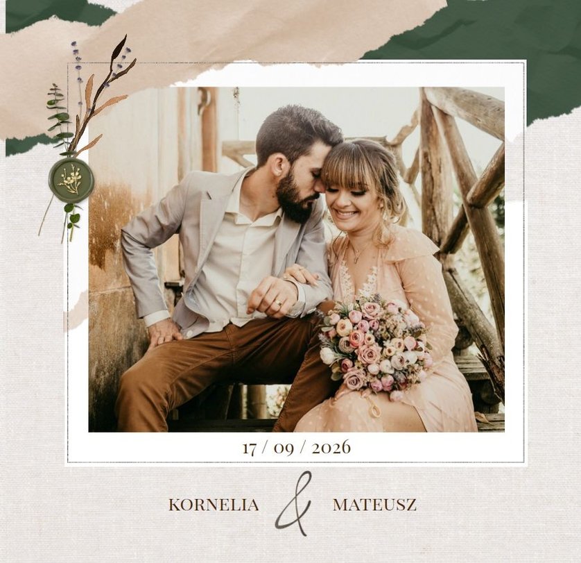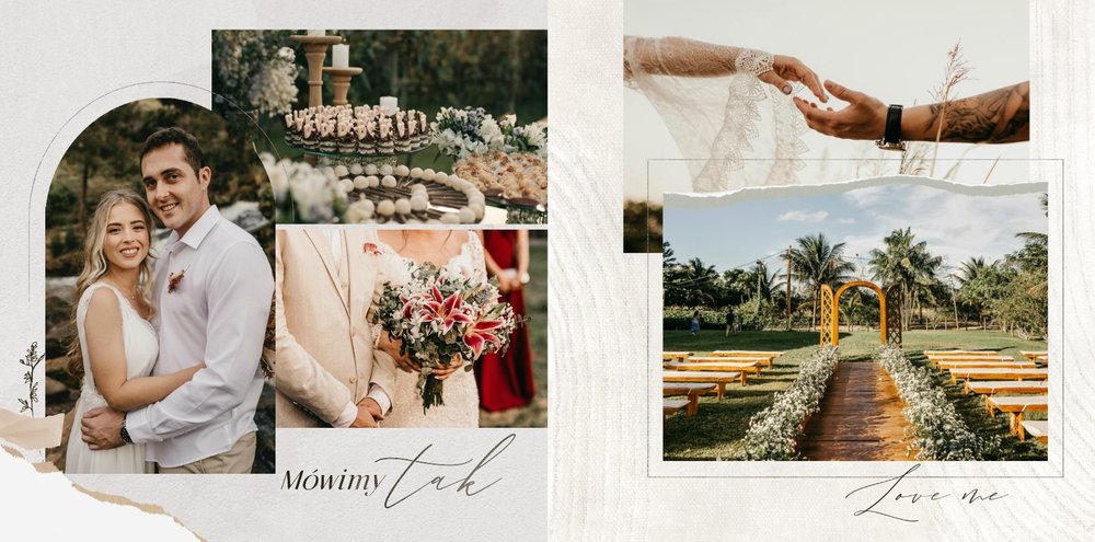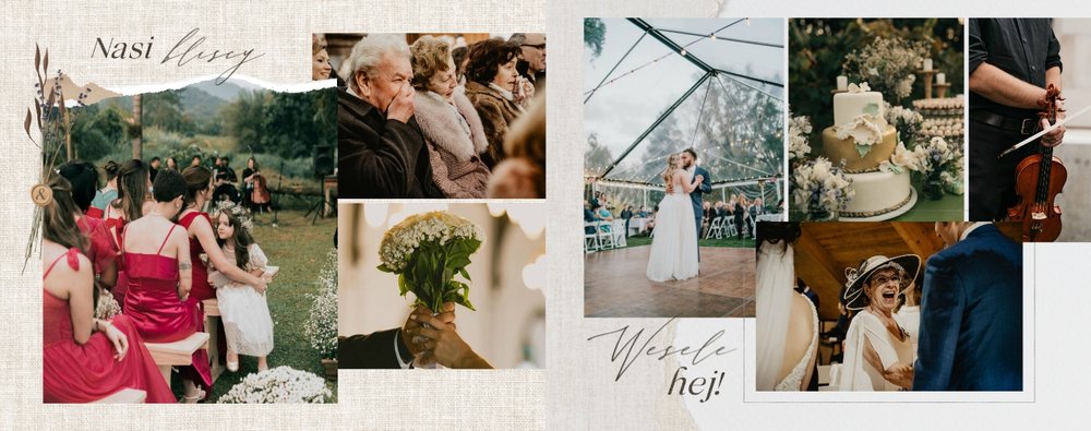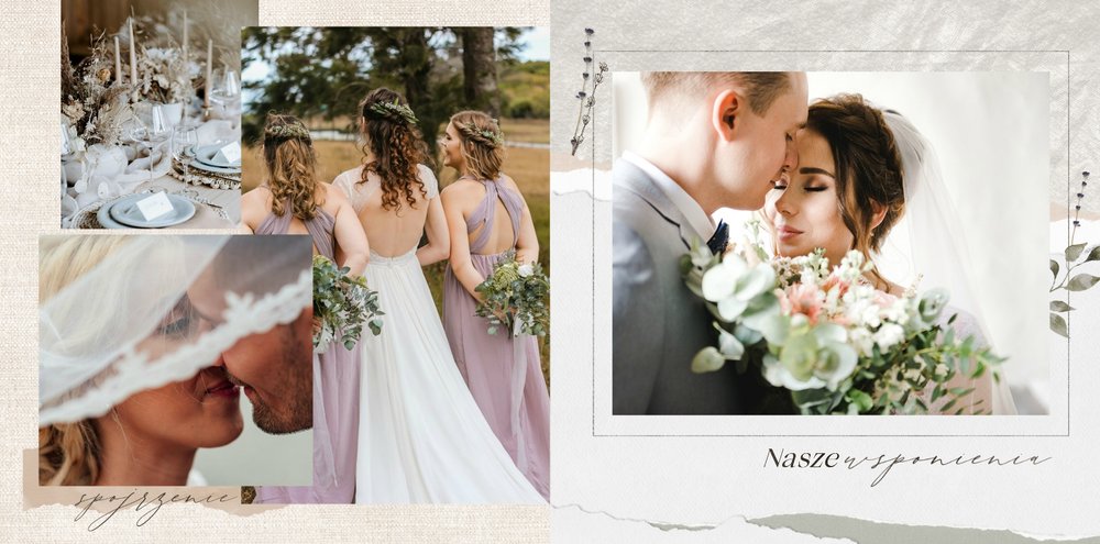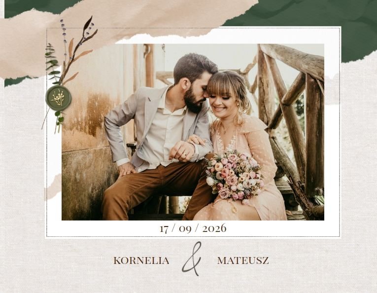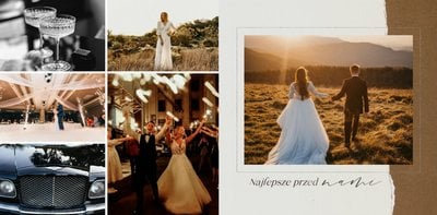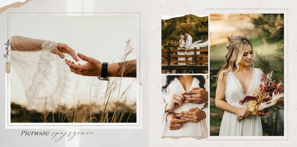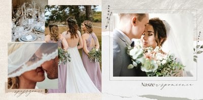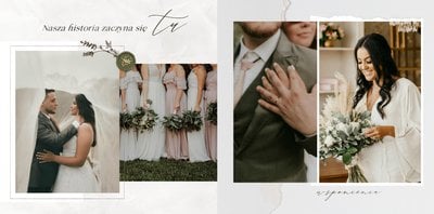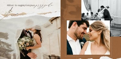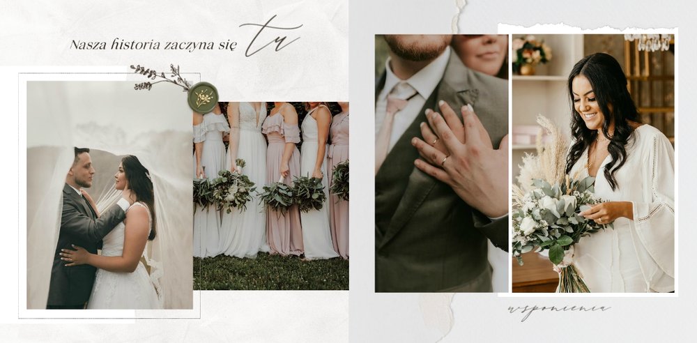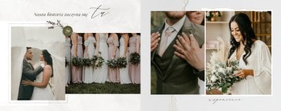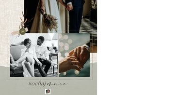 Fotoksiążka "Ślub w plenerze" to propozycja dla osób ceniących delikatność, naturę i minimalizm. Kolory szablonu - beż, butelkowa zieleń i biel - idealnie pasują do fotografii ślubnych w stylu rustykalnym i boho. Strony przyozdobione zostały w subtelne elementy bliskie romantycznej naturze, takie jak skrawki papeterii, polne kwiatki oraz woskowe pieczęcie. Cienkie ramki okalające zdjęcia podkreślą ich elegancję. Czułe, krótkie teksty, nawiązujące do ważnych momentów każdego ślubu, na zawsze zapiszą najpiękniejsze wspomnienia z tego najważniejszego dnia.