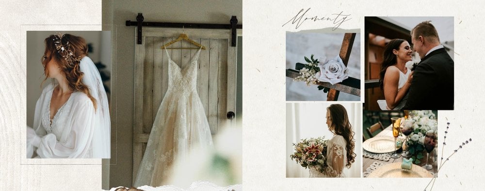 Fotoksiążka "Ślub w plenerze" to propozycja dla osób ceniących delikatność, naturę i minimalizm. Kolory szablonu - beż, butelkowa zieleń i biel - idealnie pasują do fotografii ślubnych w stylu rustykalnym i boho. Strony przyozdobione zostały w subtelne elementy bliskie romantycznej naturze, takie jak skrawki papeterii, polne kwiatki oraz woskowe pieczęcie. Cienkie ramki okalające zdjęcia podkreślą ich elegancję. Czułe, krótkie teksty, nawiązujące do ważnych momentów każdego ślubu, na zawsze zapiszą najpiękniejsze wspomnienia z tego najważniejszego dnia.