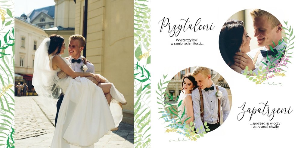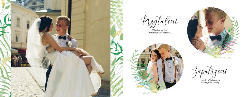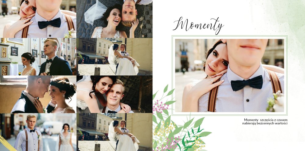 Cudowne chwile z Twojego ślubu staną się jeszcze bardziej wyjątkowe, jeśli wszystkie zapiszesz na kartach fotoksiążki. Ten ważny dla Ciebie dzień podsumuj za pomocą fotografii, ponieważ tym sposobem, na lata zachowasz zdjęcia wewnątrz minimalistycznej fotoksiążki. Całość szablonu Ślubne Love idealnie dopełnią delikatne i zielone elementy graficzne oraz ozdobne napisy na poszczególnych stronach. Możesz mieć pewność, że z tym szablonem zaprojektujesz oryginalną pamiątkę dla siebie, rodziców, czy dziadków.