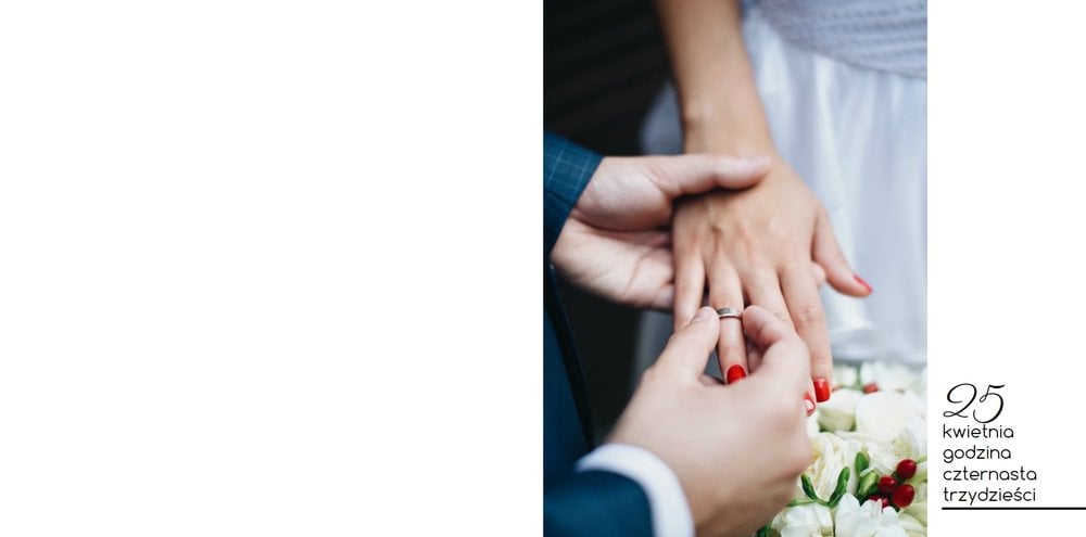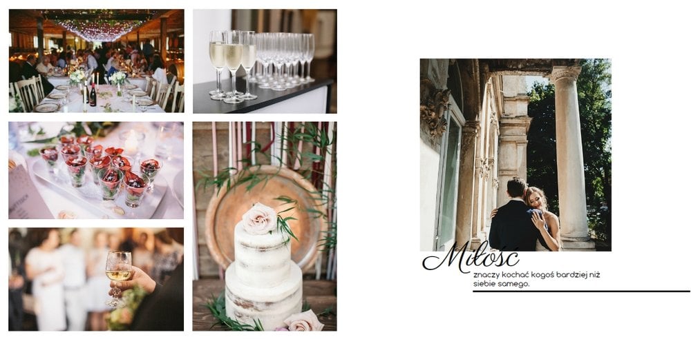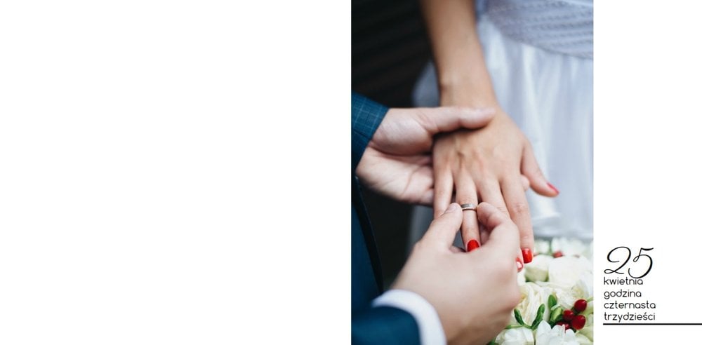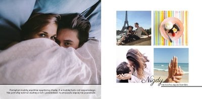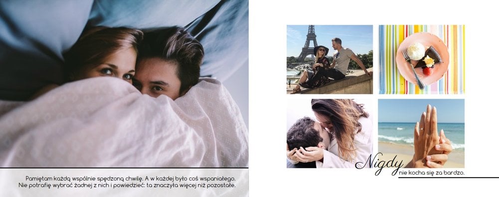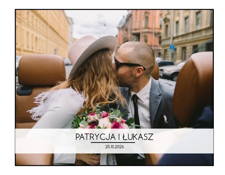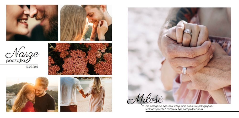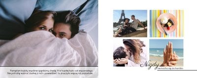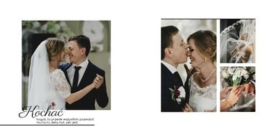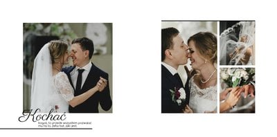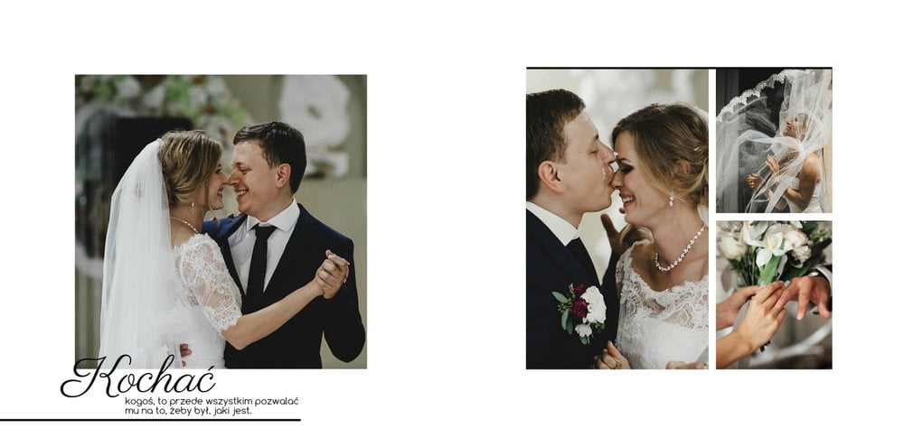 Piękne, dobrze skadrowane zdjęcia nie potrzebują dodatkowych ozdobników w postaci tła i kolorowych czcionek, dlatego profesjonalna fotografia ślubna zostanie idealnie wyeksponowana w szablonie “Ślubny Minimalizm”. Prosty układ graficzny, kontrast czerni i bieli, wysmakowana, klasyczna czcionka idealnie komponuje się z czarno-białą fotografią artystyczną. Fotoksiążka ślubna zaprojektowana z tym szablonem to idealny pomysł na uwiecznienie ślubu marzeń.