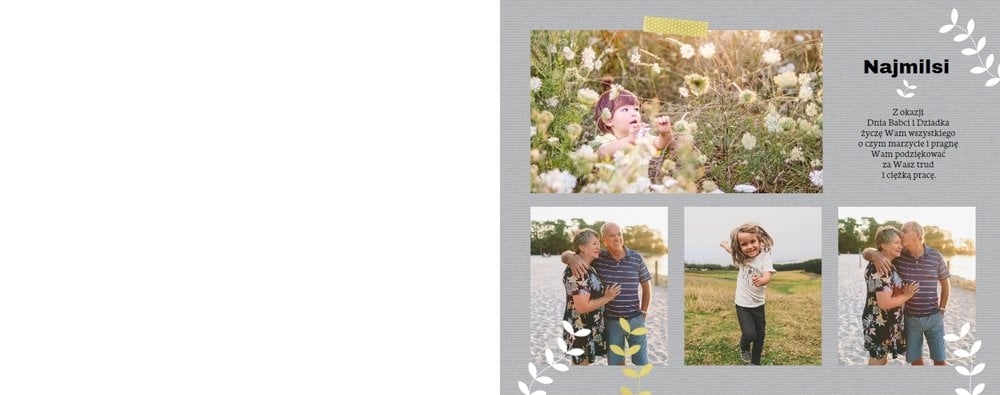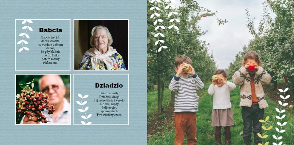 Jak podziekować Dziadkom za opiekę i wsparcie? Fotoksiążka z szablonem Dla Dziadków stanie się piękną pamiątką i prezentem z okazji ich święta. Szablon zaprojektowany specjalnie pod tę wyjątkową okazję, to ciepłe kolory, oryginalne wzory oraz układy, które pomieszą wiele rodzinnych zdjęć. Fotoksiążkę Dla Dziadków dedykujemy wszystkim wnukom, które chcą podarować kochanej Babci i kochanemu Dziadkowi coś wyjątkowego.