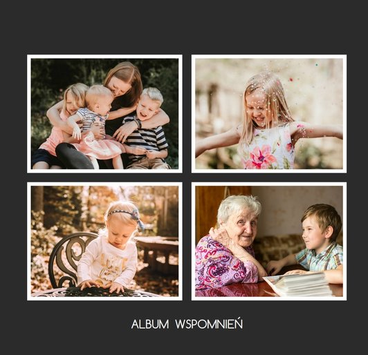 Albumy to skarbnica wspomnień, szczególnie tych rodzinnych. Fotoksiążka to świetna alternatywa, dlatego w szablonie Tradycyjny album na zdjęcia znajdziesz mnóstwo miejsca na fotografie, które dla Ciebie i Twojej rodziny są najważniejsze. Minimalistyczny szablon w ciemnym odcieniu oraz delikatne ramki na zdjęcia to idealne połączenie Twoich zdjęć w jedną, wyjątkową rodzinna historię.