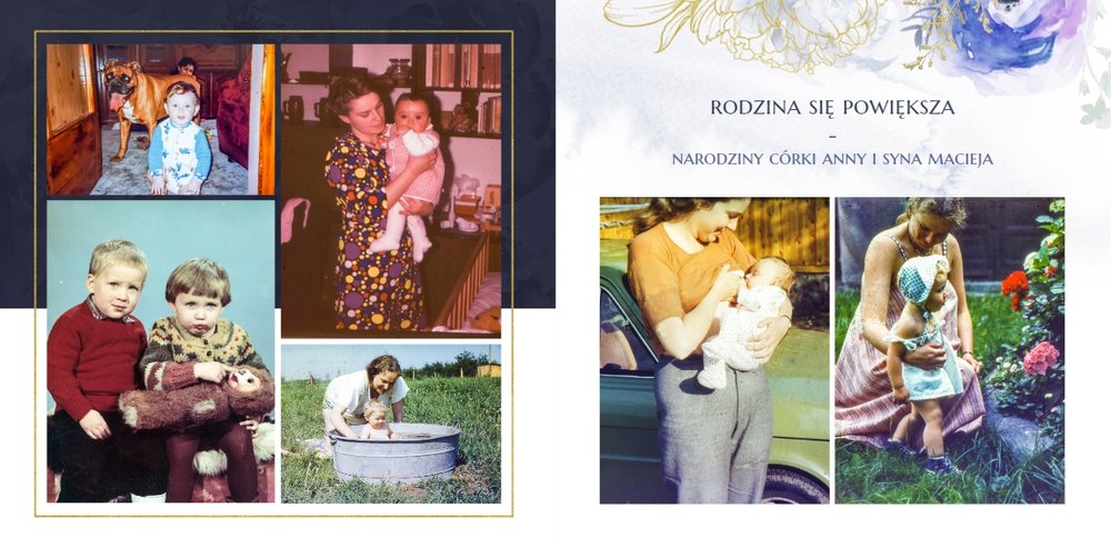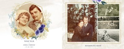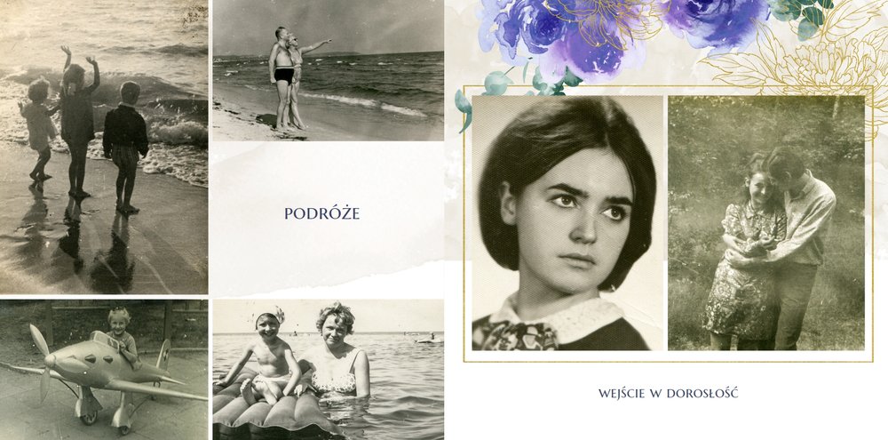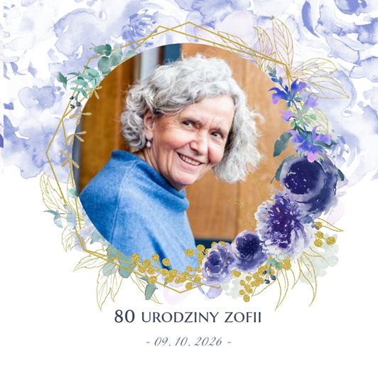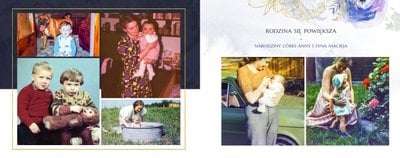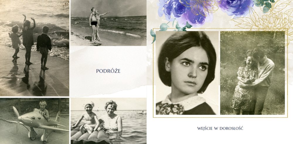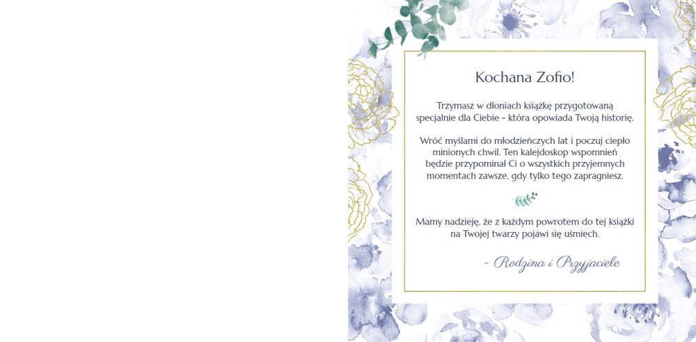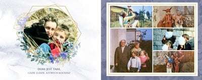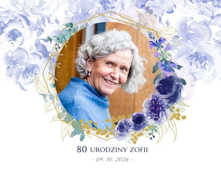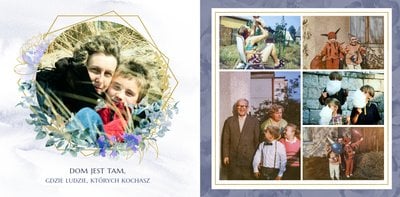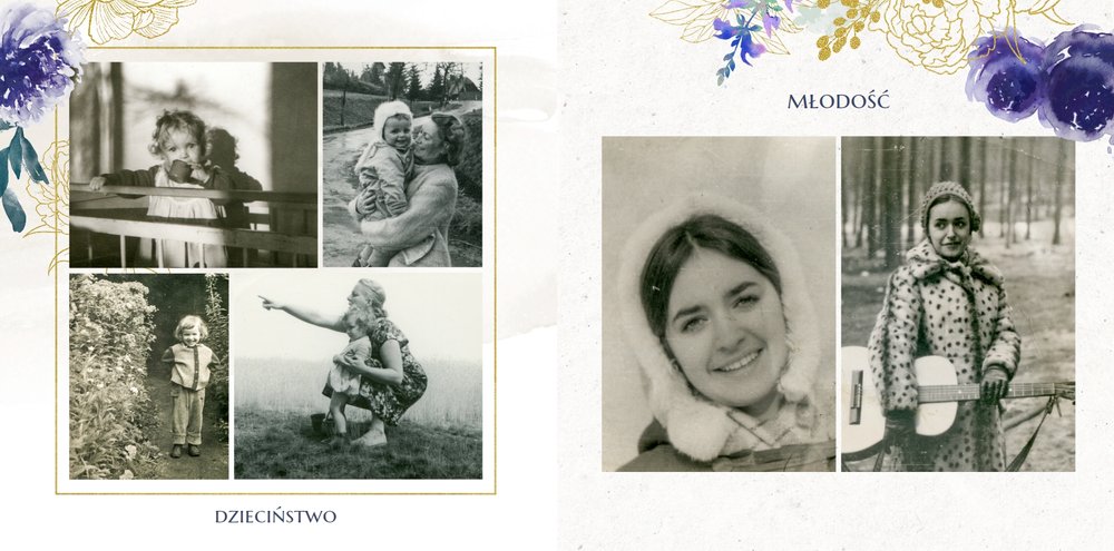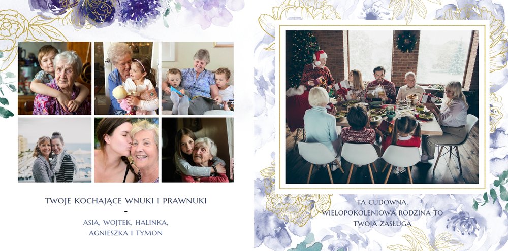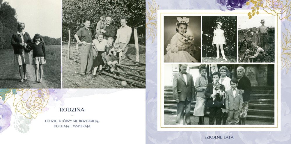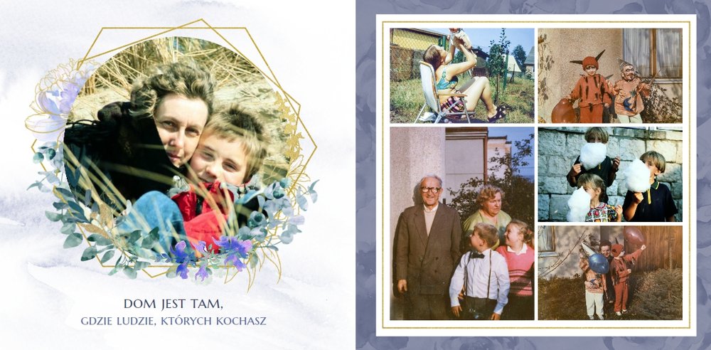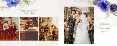 Motywem przewodnim szablonu "Urodziny seniora" są szafirowe kwiaty. Lekkości dodają złote zdobienia i pełne uznania wzruszające teksty. Całość tworzy bogate uzupełnienie komórek, w których można umieścić skany fotografii sprzed lat i aktualne zdjęcia.