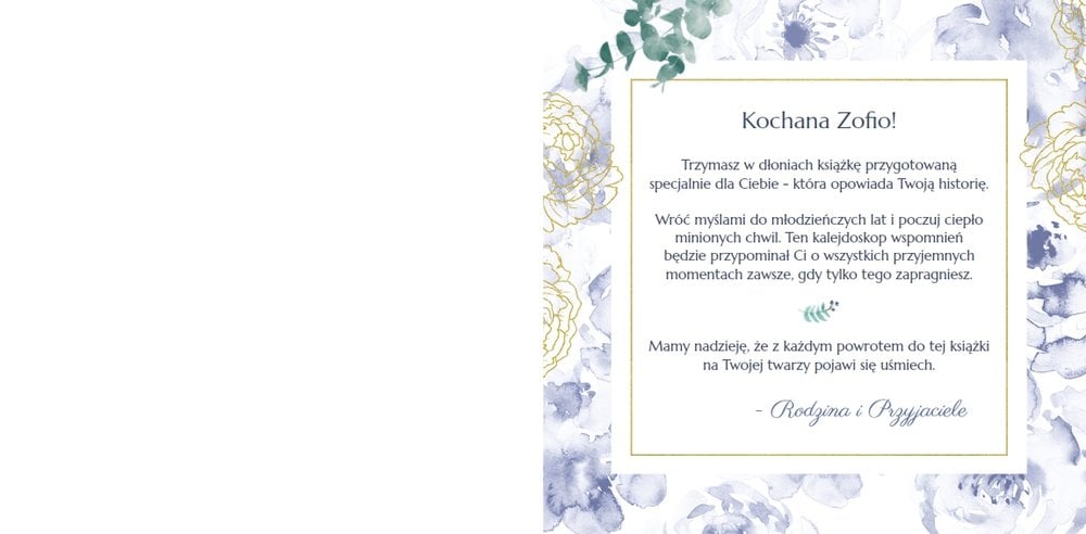 Motywem przewodnim szablonu "Urodziny seniora" są szafirowe kwiaty. Lekkości dodają złote zdobienia i pełne uznania wzruszające teksty. Całość tworzy bogate uzupełnienie komórek, w których można umieścić skany fotografii sprzed lat i aktualne zdjęcia.