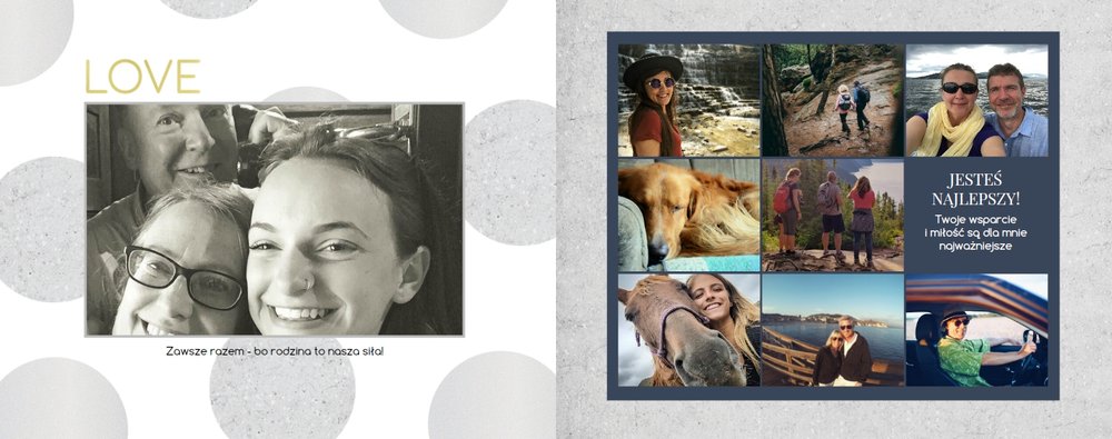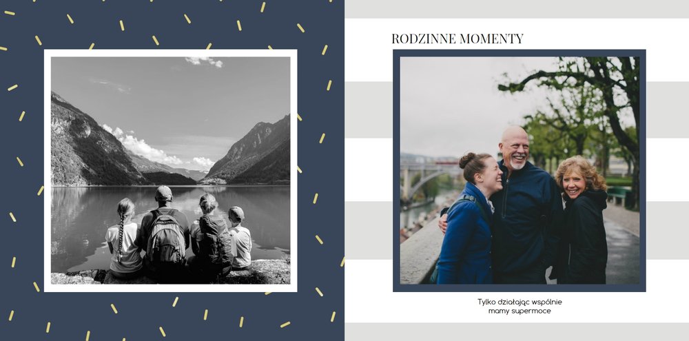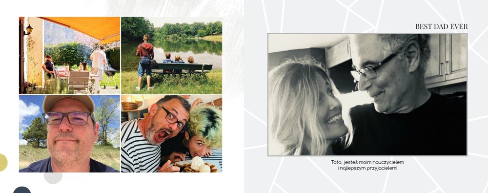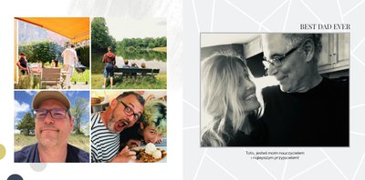 Czerwiec to miesiąc świętowania dla wszystkich Ojców, dlatego z tej okazji przygotowaliśmy szablon W dniu Taty. Z jego pomocą wyrazisz w prosty sposób to, co najtrudniejsze - miłość, wyrazy wdzięczności i podziękowania za wspólne przeżycia. Dzięki temu nowoczesnemu, a jednocześnie eleganckiemu szablonowi zdjęcia Taty nabiorą wdzięku sprawią mu wiele radości w trakcie przeglądania. Decydując się na prezent w formie fotoksiążki masz pewność, że uchwycisz wszystkie chwile z Tatą w jednym miejscu i zadbasz o rodzinne wspomnienia na długie, długie lata. Wewnątrz szablonu znajdziesz białe tła oraz motywy graficzne w odcieniach granatu, szarości i złota - całość tworzy uniwersalny pomysł na prezent dla Taty.