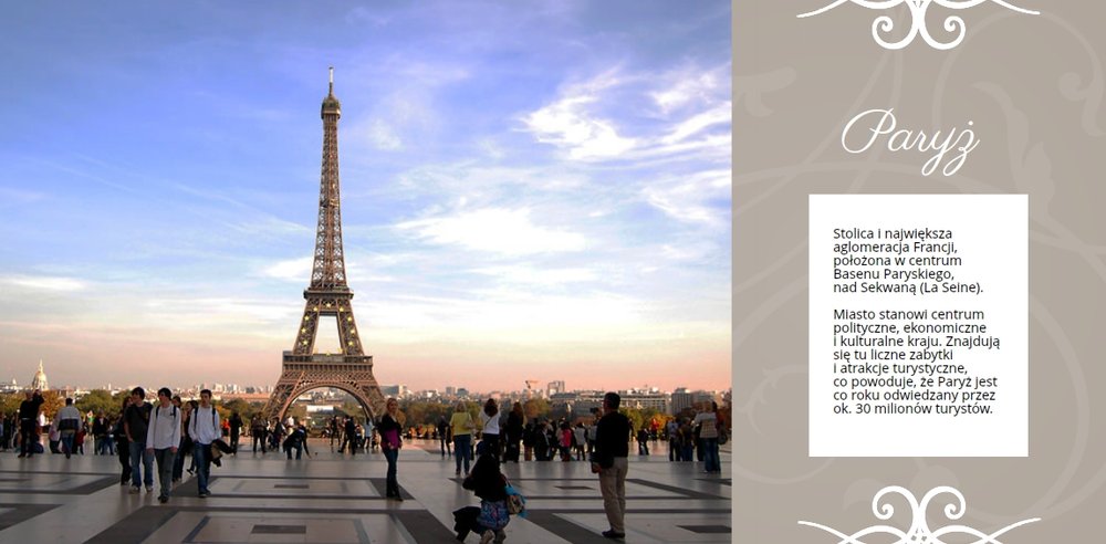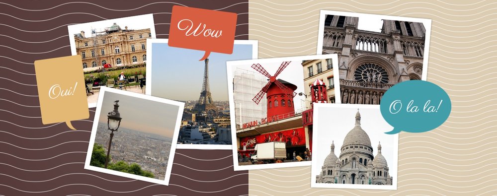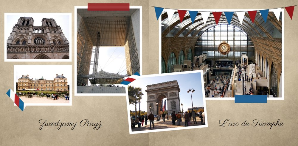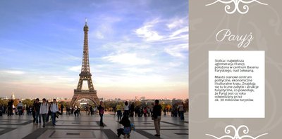 Francja - elegancka i wyrafinowana, ma do zaoferowania zabytkowe miasta, piękne góry i wspaniałe kurorty. Wybierając się na wakacje do Francji, możemy być pewni, że wiele zobaczymy, wrócimy zadowoleni i przywieziemy ze sobą setki zdjęć. Po powrocie wybierzmy ulubione kadry i stwórzmy z nich piękną pamiątkę z wakacji. Szablon utrzymany jest w klimacie wakacyjnym, z ciekawymi układami i miejscami na opisy odwiedzonych miejsc.