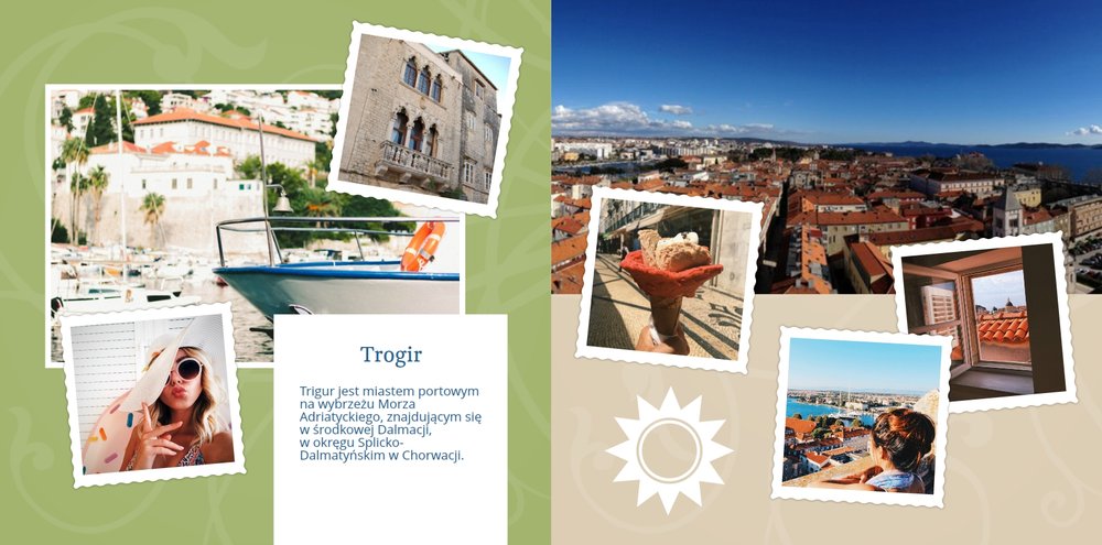 Ponoć kto już raz odwiedził Chorwację, zawsze będzie chciał tam wrócić. Piękne zakątki, krystalicznie czysta woda, romantyczne porty rybackie oraz 1185 wysp, rozrzuconych wzdłuż wybrzeża. Wybierając się na wakacje do Chorwacji, możemy być pewni, że wrócimy zadowoleni i przywieziemy ze sobą setki zdjęć. Po powrocie stwórzmy z nich piękną pamiątkę - fotoksiążkę. Szablon "Chorwacja" utrzymany jest w klimacie wakacyjnym, z ciekawymi układami i miejscami na opisy odwiedzonych miejsc.