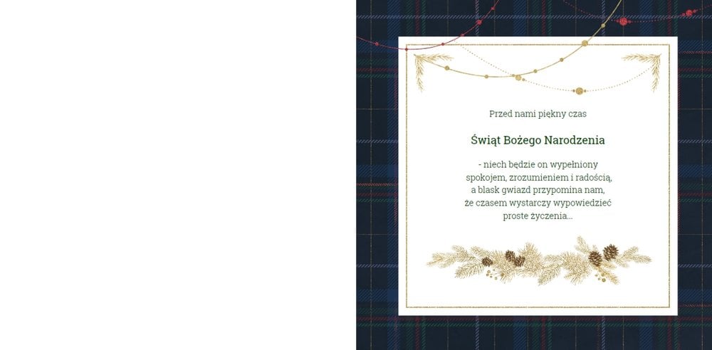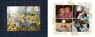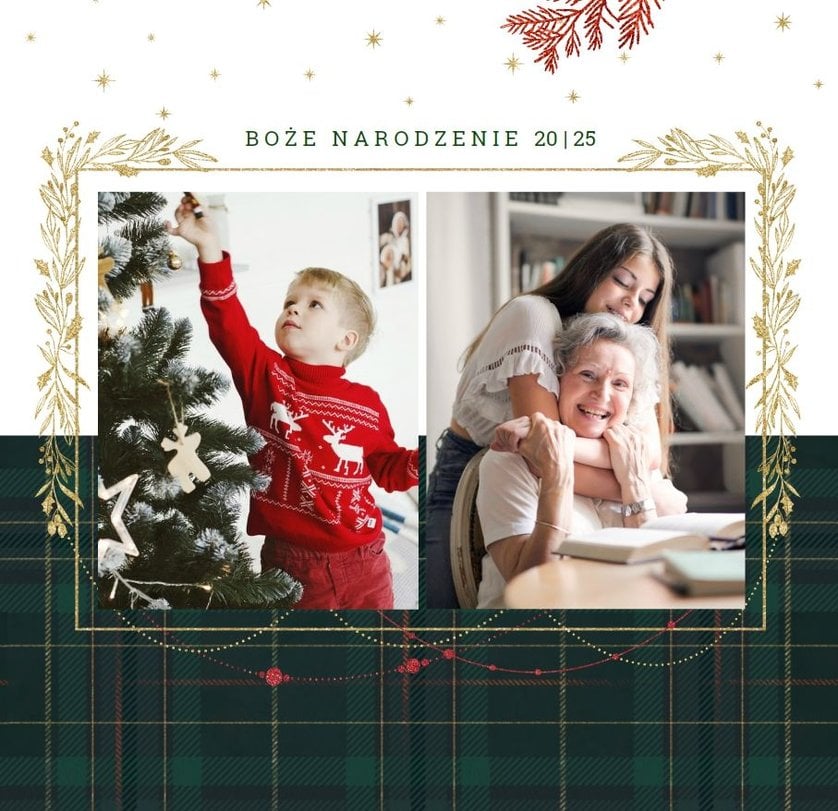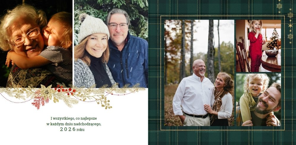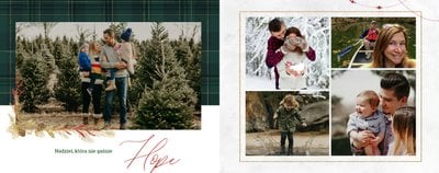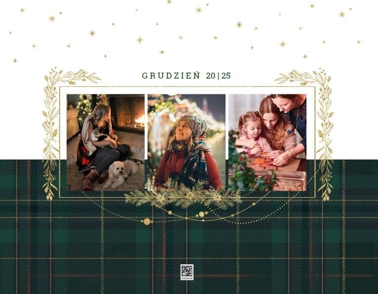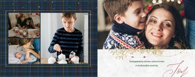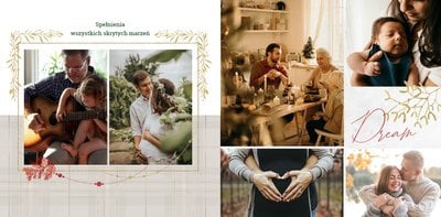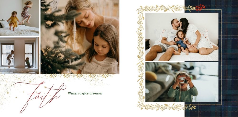 Eleganckie motywy kraty, roślinne ornamenty i złote detale stworzą nowoczesne tło Twoich ulubionych fotografii. Dzięki stonowanej i kolorystyce, fotoksiążka z szablonem "Wigilijna niespodzianka", sprawdzi się zarówno w prezencie dla kobiety, jak i mężczyzny.