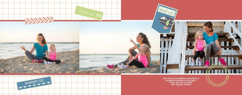 Szablon Wspomnienia z wakacji jest idealny na pamiątkę rodzinnych wakacji. Stworzyliśmy go z myślą o miłośnikach morza, szumu fal i zamków z piasku. Inspirowaliśmy się kolorami lata, a strony szablonu dodatkowo urozmaiciliśmy ciekawymi podróżniczymi motywami. Dodaj swoje zdjęcia i teksty, a stworzona fotoksiążka pozwoli Ci przenieść się nad morze, kiedy tylko zapragniesz. Szablon idealny na wakacyjną, rodzinną pamiątkę.