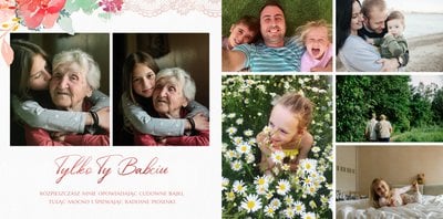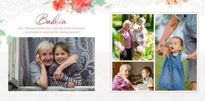 Wnętrze szablonu wypełniają koronkowe motywy oraz kolorowe kwiaty. Dodaje to lekkości i sprawia, że fotoksiążka wypełniona najzwyklejszymi zdjęciami, będzie niezwykłą pamiątką i idealnym prezentem, do którego Babcia będzie powracała z uśmiechem.