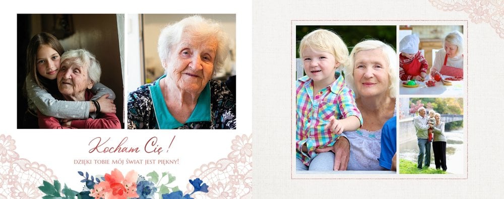 Wnętrze szablonu wypełniają koronkowe motywy oraz kolorowe kwiaty. Dodaje to lekkości i sprawia, że fotoksiążka wypełniona najzwyklejszymi zdjęciami, będzie niezwykłą pamiątką i idealnym prezentem, do którego Babcia będzie powracała z uśmiechem.