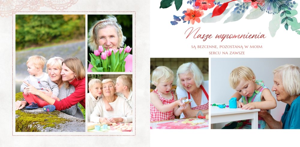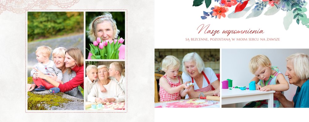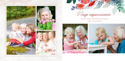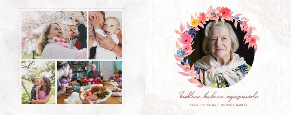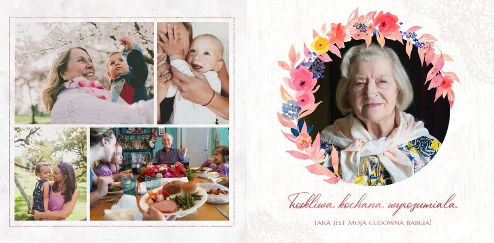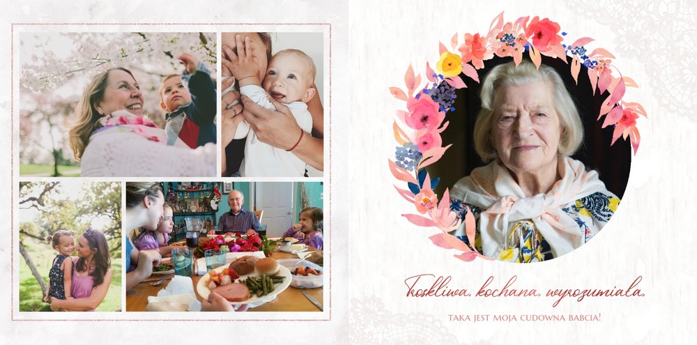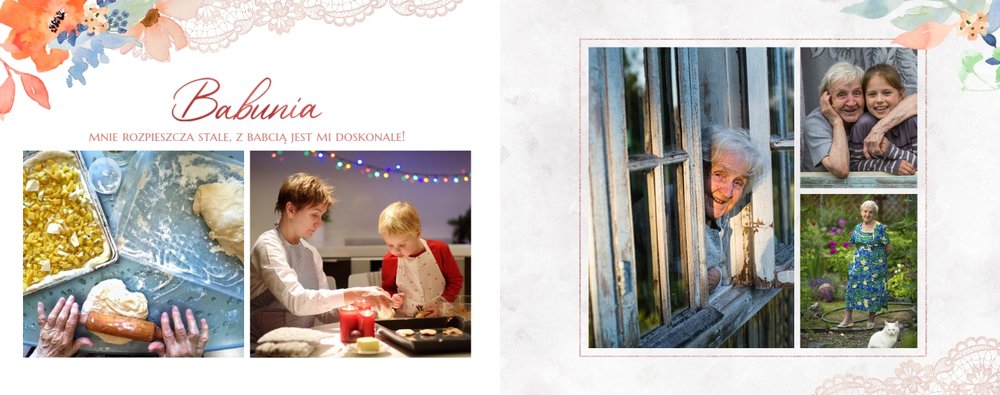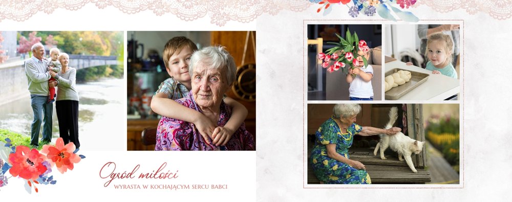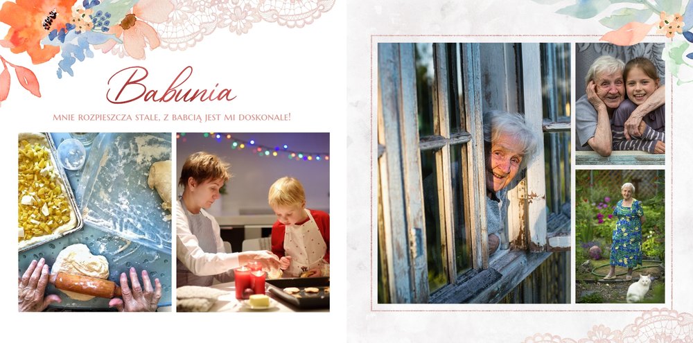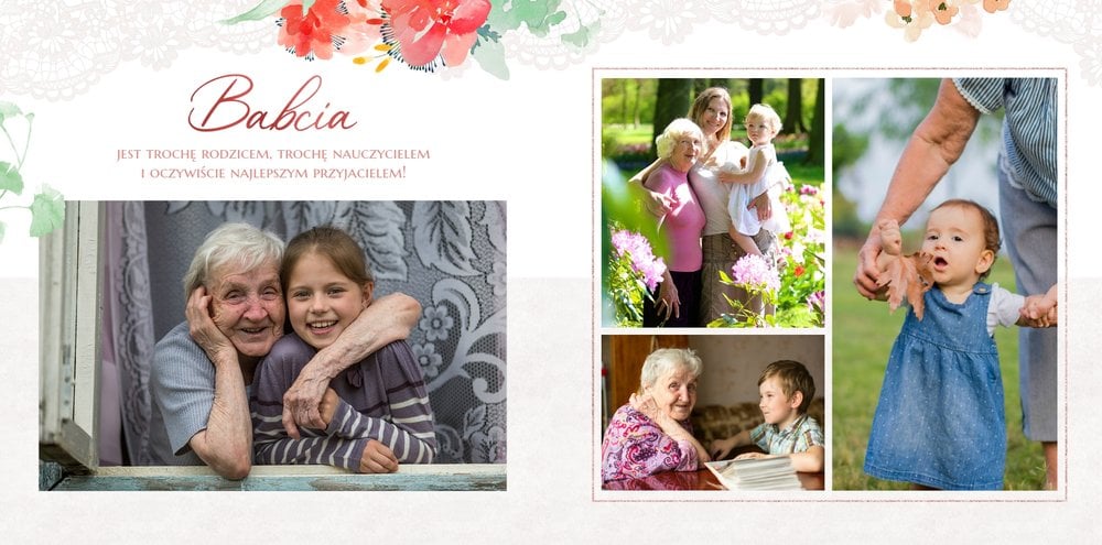 Wnętrze szablonu wypełniają koronkowe motywy oraz kolorowe kwiaty. Dodaje to lekkości i sprawia, że fotoksiążka wypełniona najzwyklejszymi zdjęciami, będzie niezwykłą pamiątką i idealnym prezentem, do którego Babcia będzie powracała z uśmiechem.