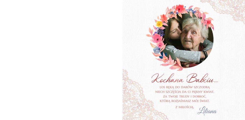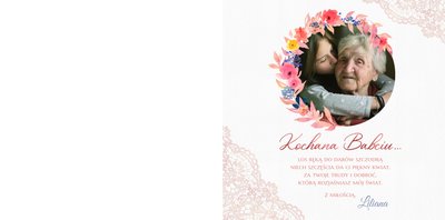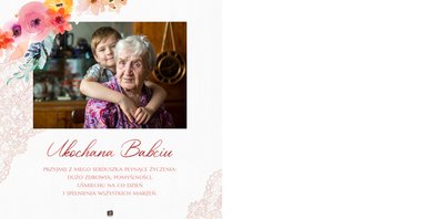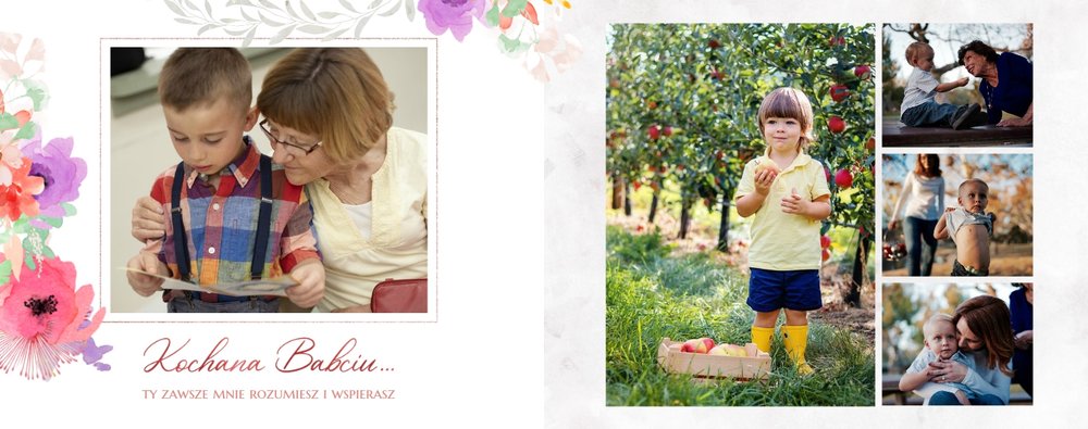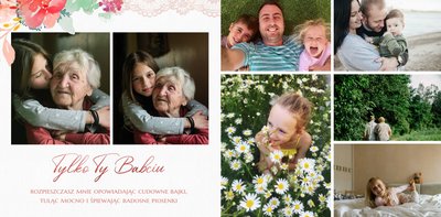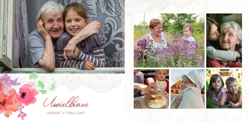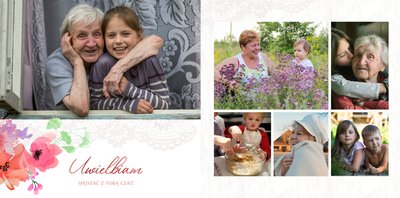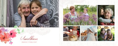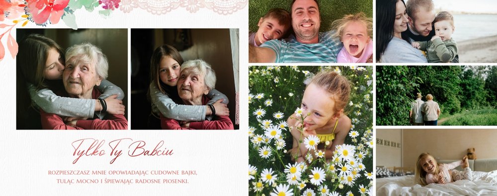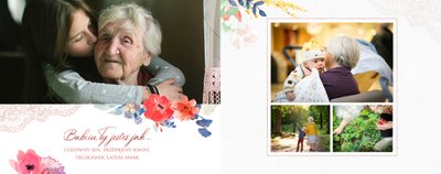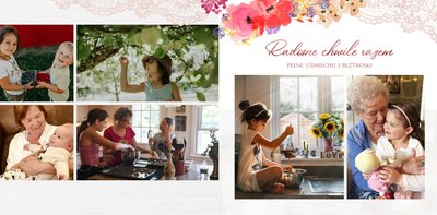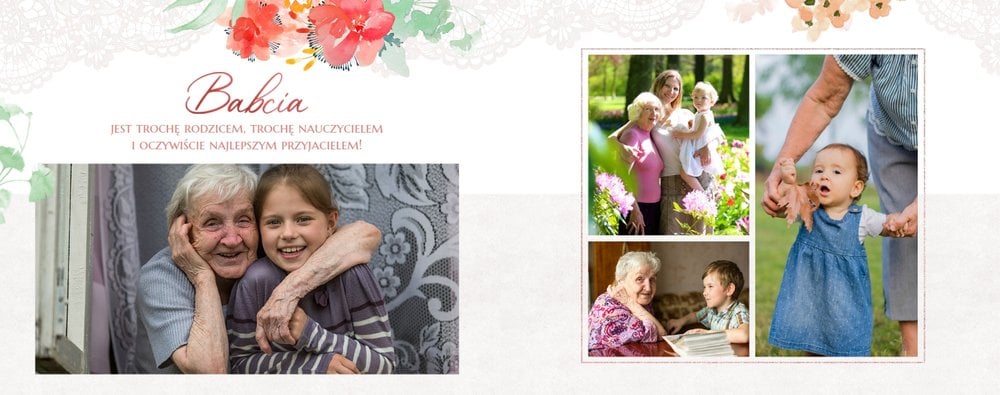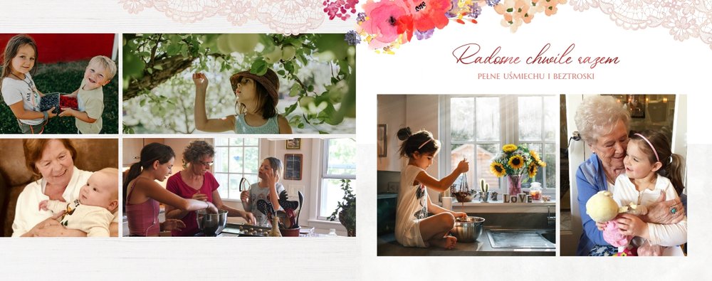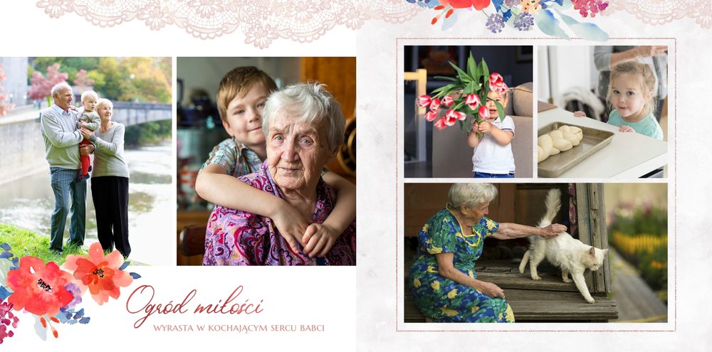 Wnętrze szablonu wypełniają koronkowe motywy oraz kolorowe kwiaty. Dodaje to lekkości i sprawia, że fotoksiążka wypełniona najzwyklejszymi zdjęciami, będzie niezwykłą pamiątką i idealnym prezentem, do którego Babcia będzie powracała z uśmiechem.