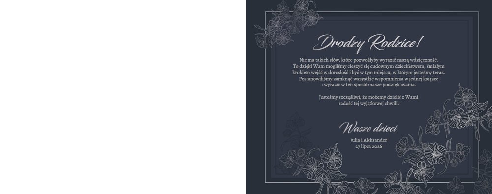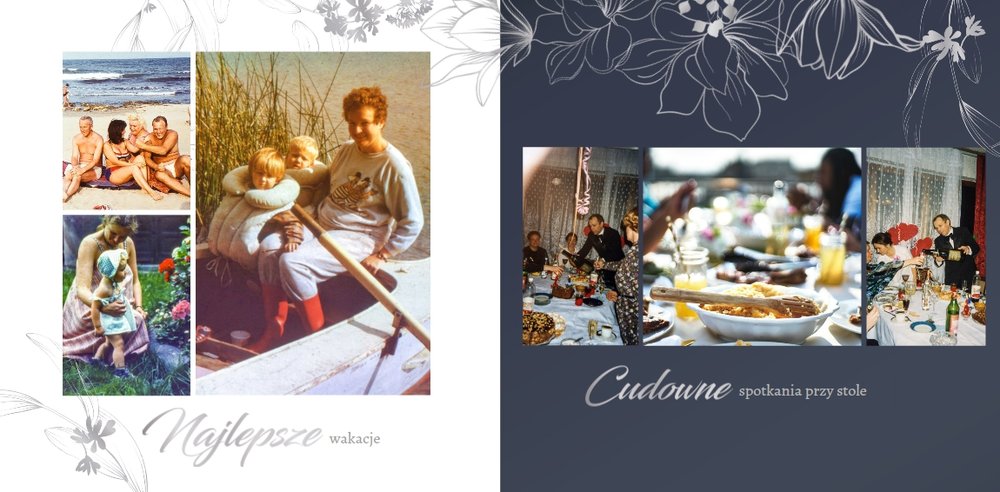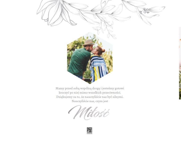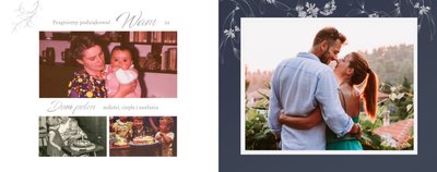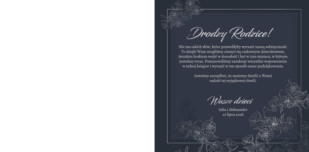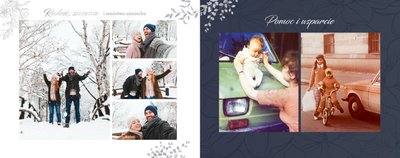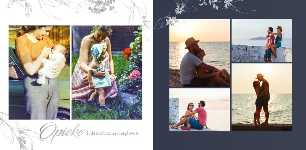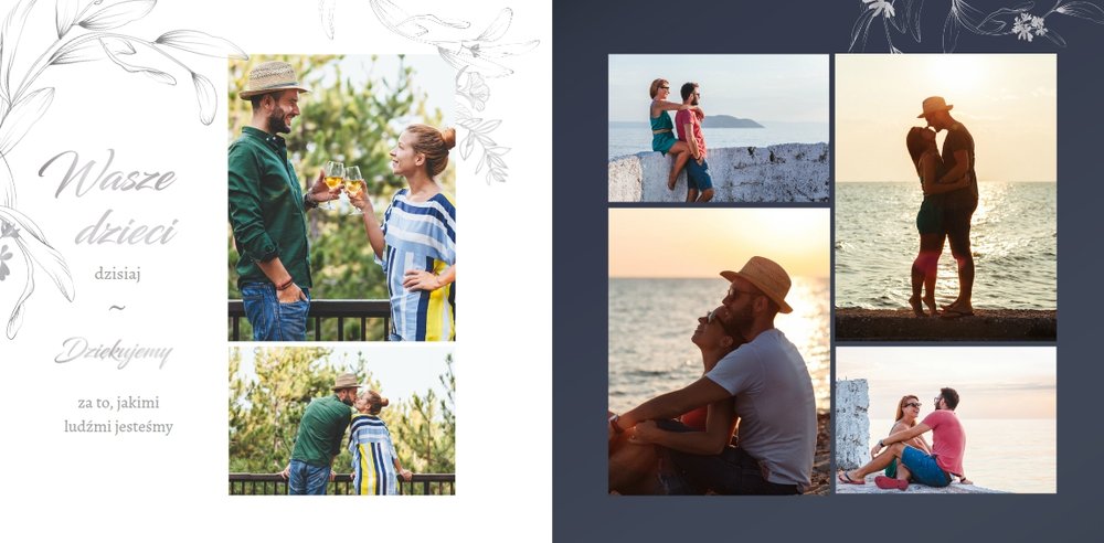 Dzień Waszego ślubu to jeden z najważniejszych dni w życiu! Jednak tego dnia należy także pamiętać o Rodzicach i podziękować im za troskę, miłość, zrozumienie i wsparcie w trudnych chwilach. Nawet nie zdajesz sobie sprawy, jak wielką przyjemność sprawisz im tego dnia, wręczając tak wzruszający prezent. Szablon Z miłości do Rodziców zapewni Ci elegancki wygląd, który idealnie sprawdzi się jako tło dla Twoich zdjęć. Mnóstwo miejsca zapewnią Ci ramki, w których umieścić może zdjęcia z Waszego dzieciństwa lub fotografie z przeszłości Waszych Rodziców. To jak będzie wyglądała fotoksiążka wewnątrz zależy wyłącznie od Ciebie.