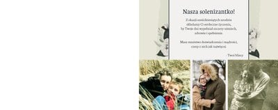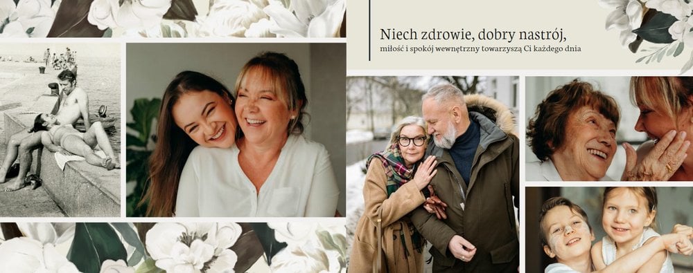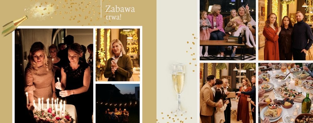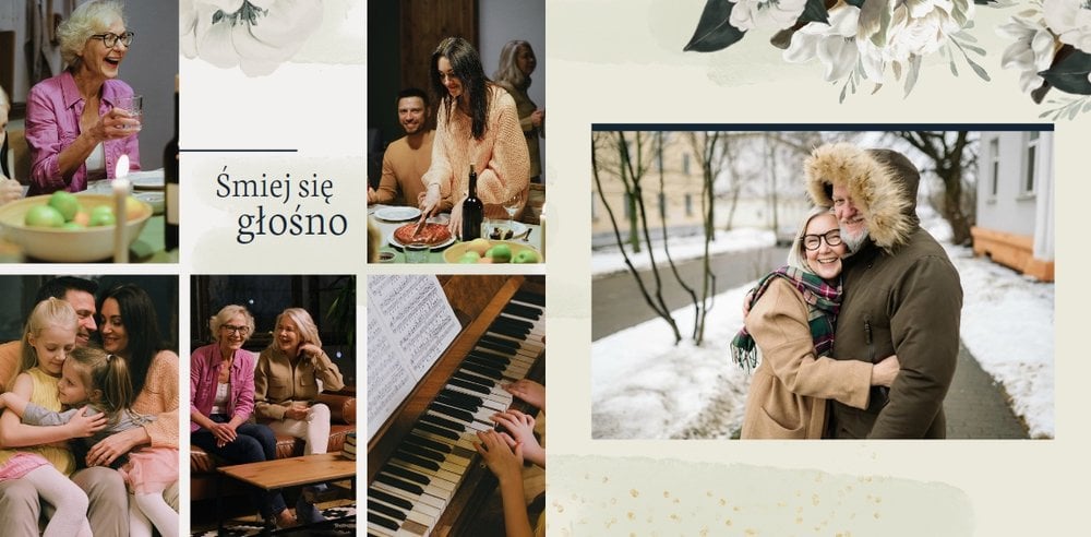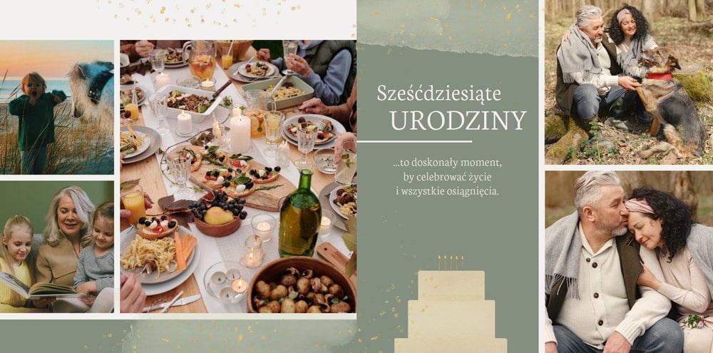 W szablonie dominują odcienie zieleni, beżu i granatu. Niezwykłości dodają złote, subtelne dodatki, które nie dają zapomnieć jakiej okazji pamiątka dotyczy. Kwiatowe wzory zdobią bezcenne fotografie i dodają kobiecości projektowi. Każda strona fotoksiążki "Z okazji 60 urodzin" posiada miejsca na cudowne chwile z życia solenizantki - te spędzone z rodziną czy przyjaciółmi. Możesz skorzystać z propozycji gotowego szablonu, zyskując w kilka chwil oryginalny prezent lub każdą stronę dostosować do własnych potrzeb - zmieniając teksty, układ elementów, czy wielkość i ilość komórek zdjęciowych.
