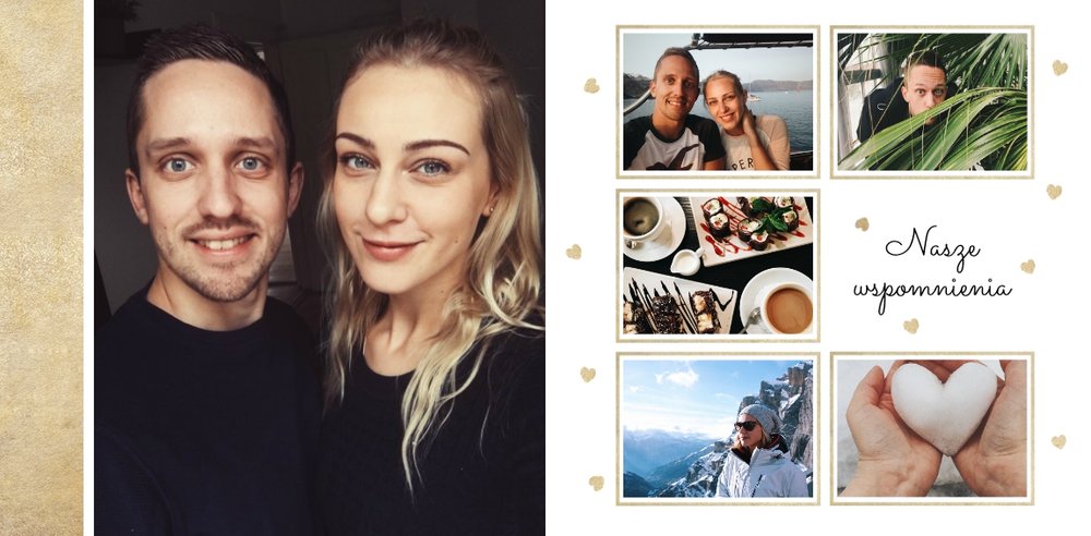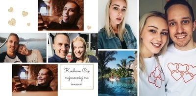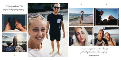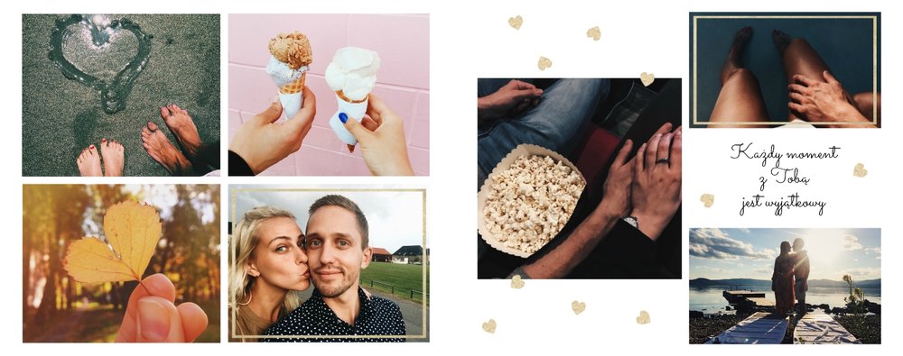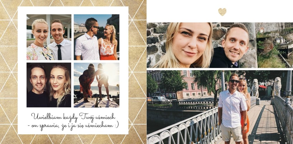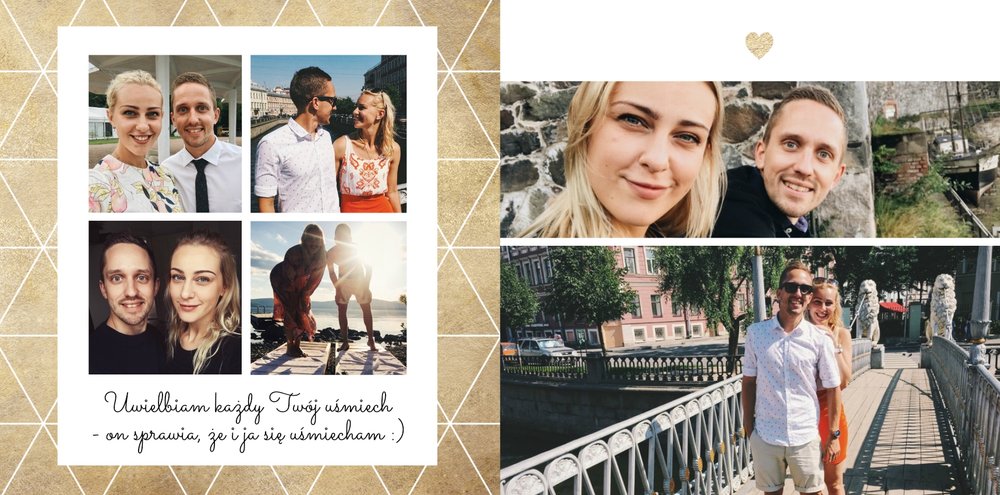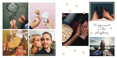 Szablon "Zakochani po uszy" to fotograficzna historia Waszej miłości - wszystkie wspólnie spędzone chwile i magiczne momenty zachowane w jednym miejscu. Czułe podpisy na stronach fotoksiążki i sentymentalne cytaty pomogą wyrazić Ci to, co naprawdę czujesz.