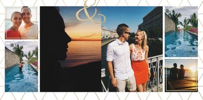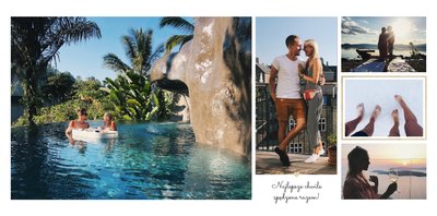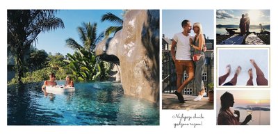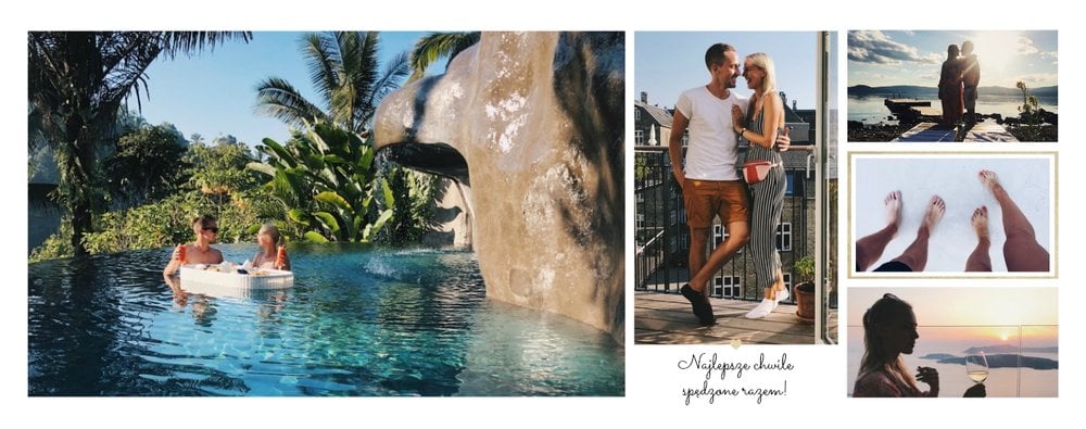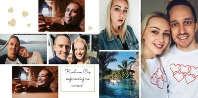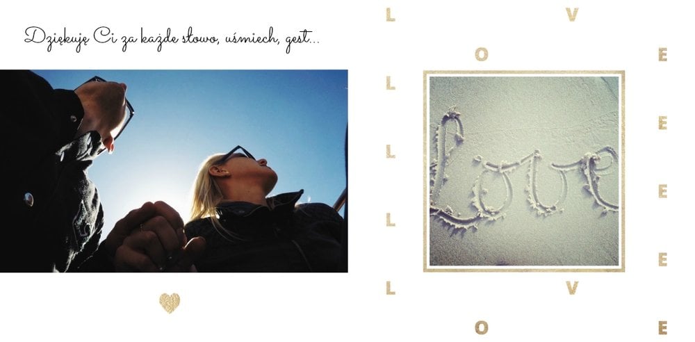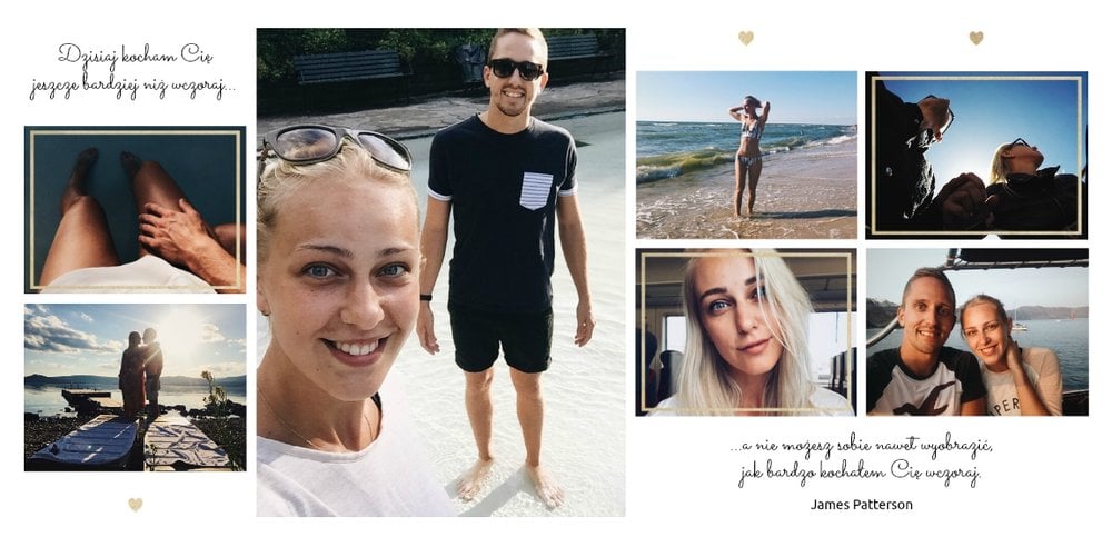 Szablon "Zakochani po uszy" to fotograficzna historia Waszej miłości - wszystkie wspólnie spędzone chwile i magiczne momenty zachowane w jednym miejscu. Czułe podpisy na stronach fotoksiążki i sentymentalne cytaty pomogą wyrazić Ci to, co naprawdę czujesz.