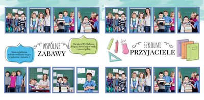 Zakończenie roku szkolnego to świetna okazja, aby stworzyć razem z dzieckiem schoolbooka z klasowych zdjęć. Taka kronika szkolna będzie piękną pamiątką dla dziecka z cudownych szkolnych lat. W szablonie Zakończenie szkoły zastosowaliśmy białe tła, na których widoczne są różnokolorowe przybory szkolne. Znajduje się w nim miejsce na zdjęcia i podpisy wszystkich uczniów oraz wychowawcy, a także na miłe klasowe wspomnienia. Szablon Zakończenie szkoły można wykorzystać do zaprojektowania fotoksiążki pamiątkowej dla całej klasy oraz jej wychowawcy.
