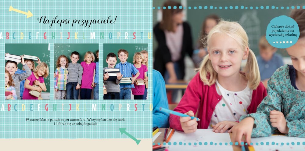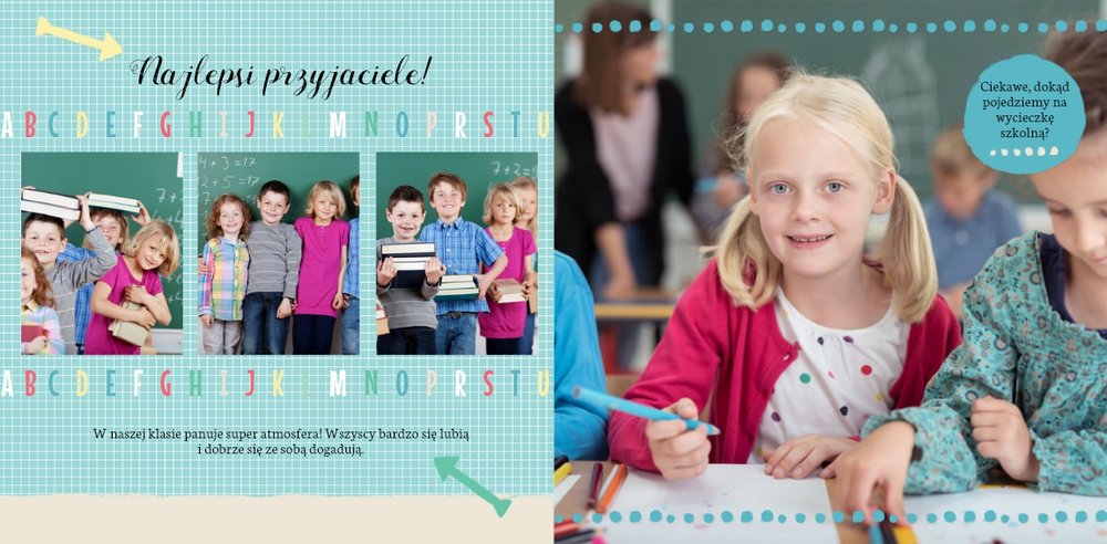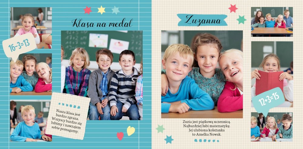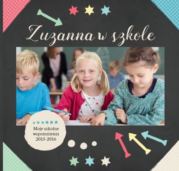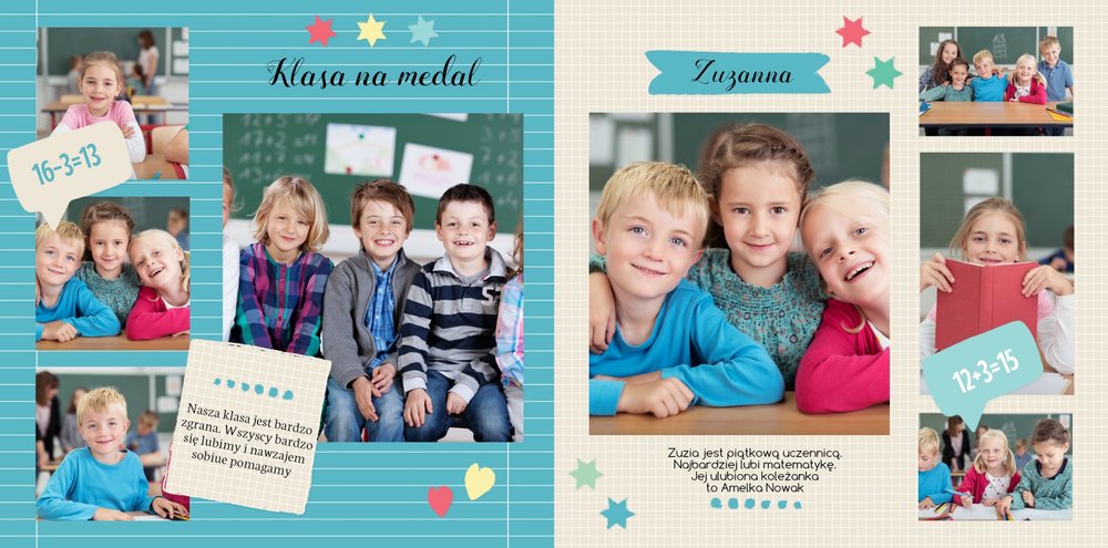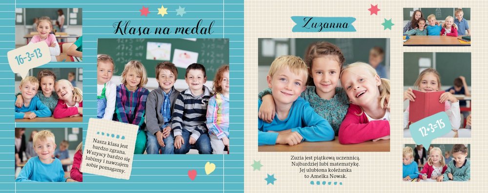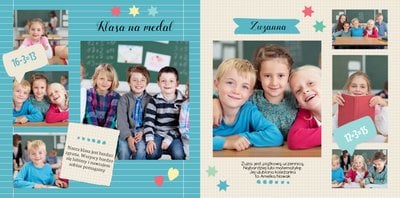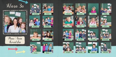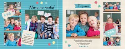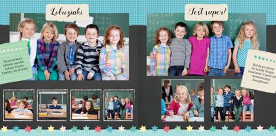 Wspomnienia z czasów szkolne to jedne z najpiękniejszych w naszym życiu. Przygotowaliśmy szablon dzięki któremu Twoje dziecko zachowa wszystkie miłe wspomnienia, zdjęcia koleżanek, kolegów oraz ulubionych nauczycieli. W tym kolorowym schoolbooku przygotowaliśmy miejsce na prywatne zapiski, wspomnienia ulubionych przedmiotów i szkolnych wycieczek oraz podpisy ulubionych kolegów z klasy. Szablon Zdjęcia klasowe to szkolny szablon, który można wykorzystać do zaprojektowania fotoksiążki pamiątkowej dla całej klasy oraz jej wychowawcy.