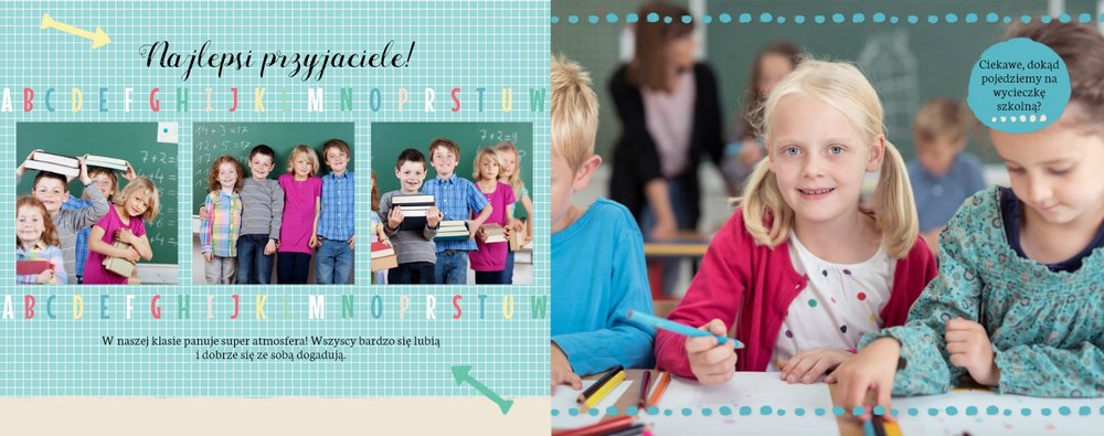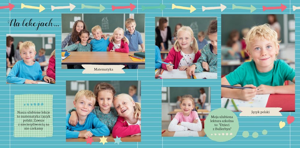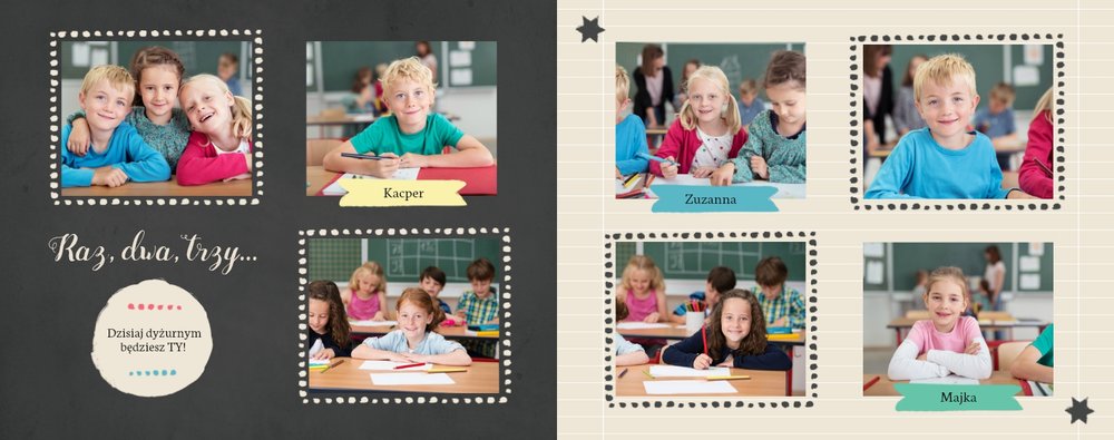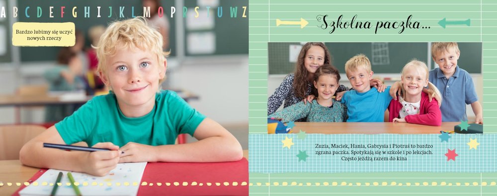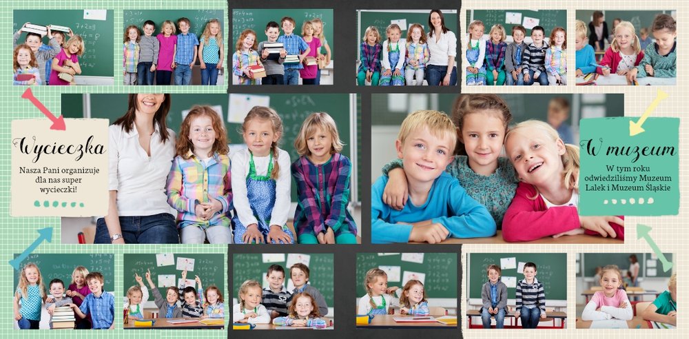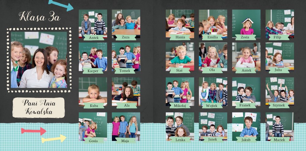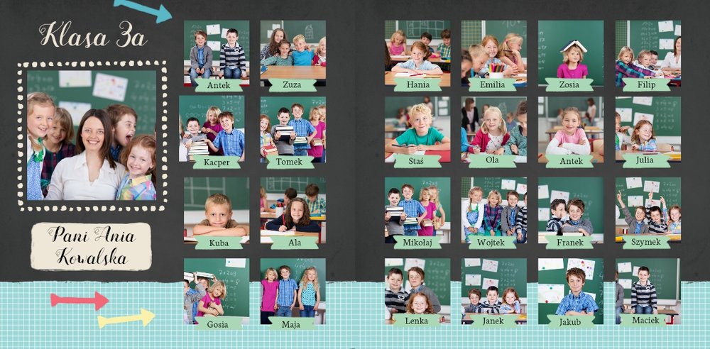 Wspomnienia z czasów szkolne to jedne z najpiękniejszych w naszym życiu. Przygotowaliśmy szablon dzięki któremu Twoje dziecko zachowa wszystkie miłe wspomnienia, zdjęcia koleżanek, kolegów oraz ulubionych nauczycieli. W tym kolorowym schoolbooku przygotowaliśmy miejsce na prywatne zapiski, wspomnienia ulubionych przedmiotów i szkolnych wycieczek oraz podpisy ulubionych kolegów z klasy. Szablon Zdjęcia klasowe to szkolny szablon, który można wykorzystać do zaprojektowania fotoksiążki pamiątkowej dla całej klasy oraz jej wychowawcy.
