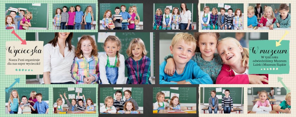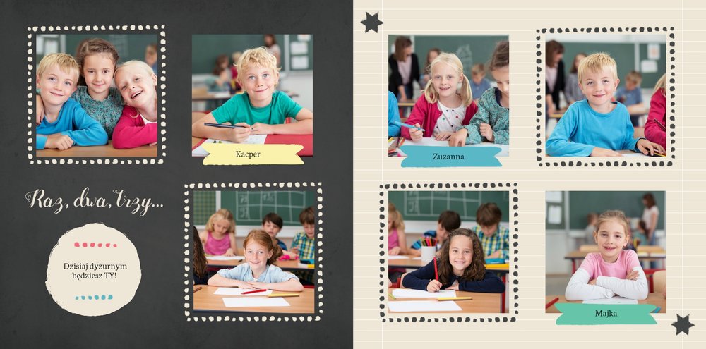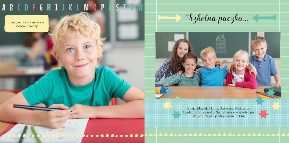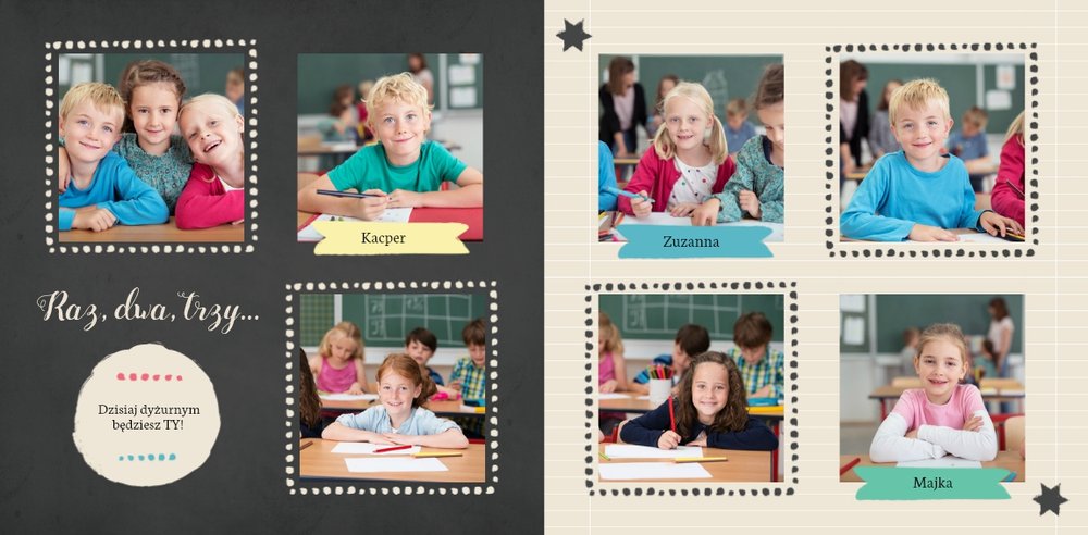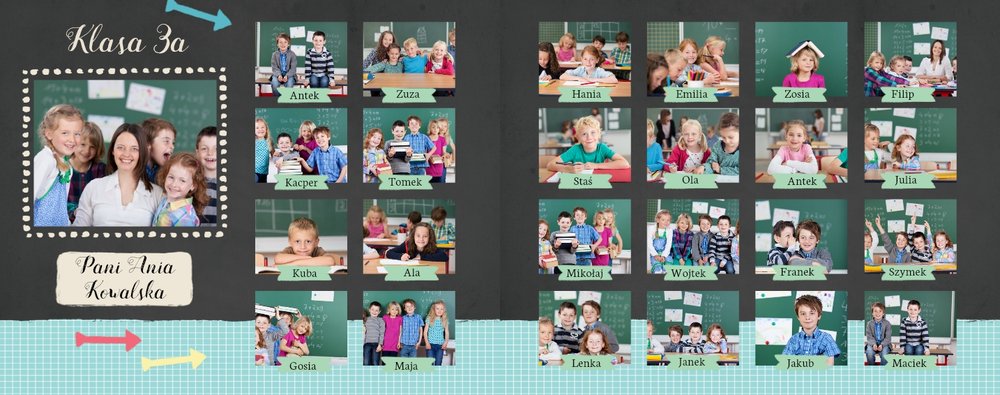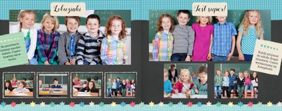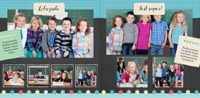 Wspomnienia z czasów szkolne to jedne z najpiękniejszych w naszym życiu. Przygotowaliśmy szablon dzięki któremu Twoje dziecko zachowa wszystkie miłe wspomnienia, zdjęcia koleżanek, kolegów oraz ulubionych nauczycieli. W tym kolorowym schoolbooku przygotowaliśmy miejsce na prywatne zapiski, wspomnienia ulubionych przedmiotów i szkolnych wycieczek oraz podpisy ulubionych kolegów z klasy. Szablon Zdjęcia klasowe to szkolny szablon, który można wykorzystać do zaprojektowania fotoksiążki pamiątkowej dla całej klasy oraz jej wychowawcy.