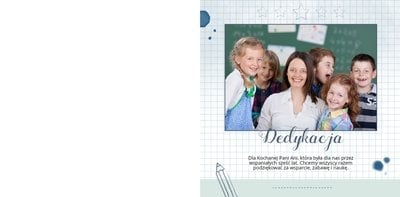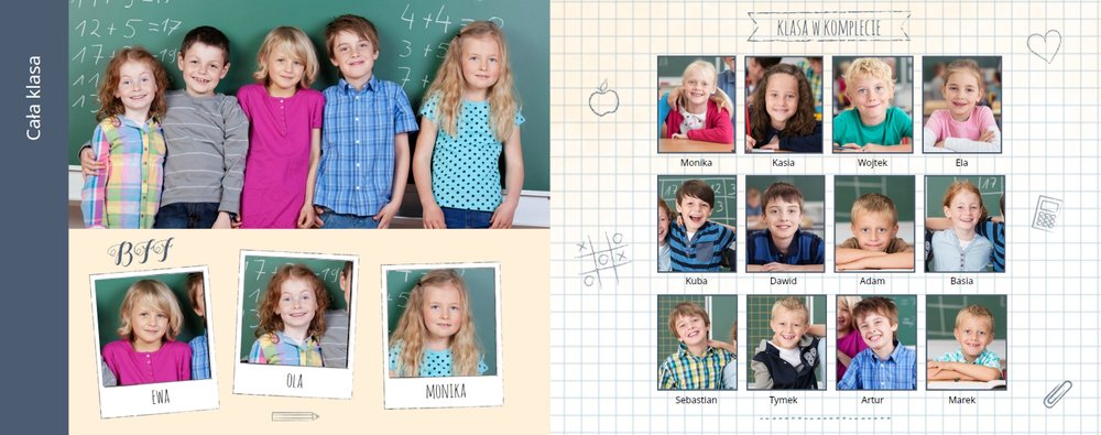 Szablon Zdjęcia szkolne idealnie sprawdzi się jako prezent na zakończenie roku dla każdego wychowawcy. Specjalne miejsce na dedykację i miejsce na podpisy całej klasy pozwolą odpowiednio spersonalizować szkolną fotoksiążkę. Kolorowe tła, tematyczne strony w postaci kartek z zeszytów, typografia dziecięca oraz polaroidy ozdabiają zdjęcia klasowe. Fotoksiążka z tym szablonem będzie świetną pamiątką dla nauczyciela Twojego dziecka.