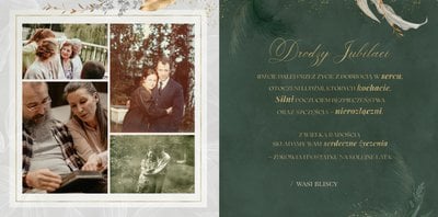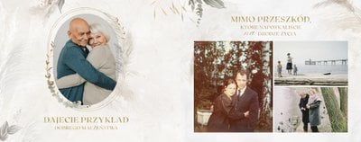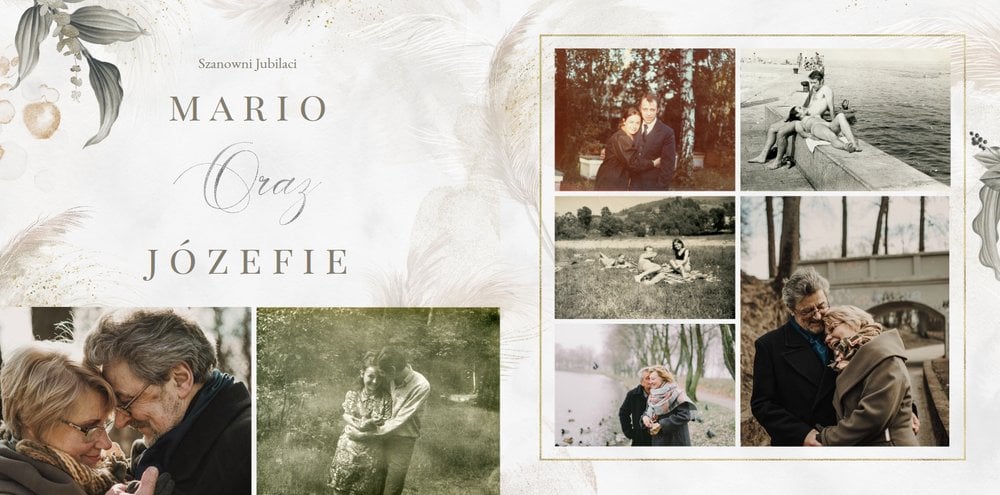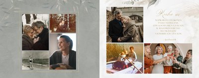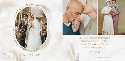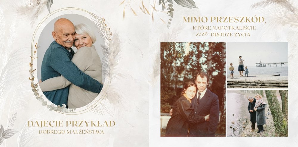 Fotoksiążka z szablonem "Złote gody" to wzruszający zbiór wspomnień, który przypomni o najpiękniejszych chwilach. Wystarczy, że wypełnisz komórki zdjęciowe obecnymi fotografiami najbliższych, ale i zeskanowanymi zdjęciami sprzed lat. Ich dopełnienie będą stanowić gotowe teksty, życzenia i sentencje, które z pewnością wywołają masę wzruszeń.
