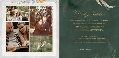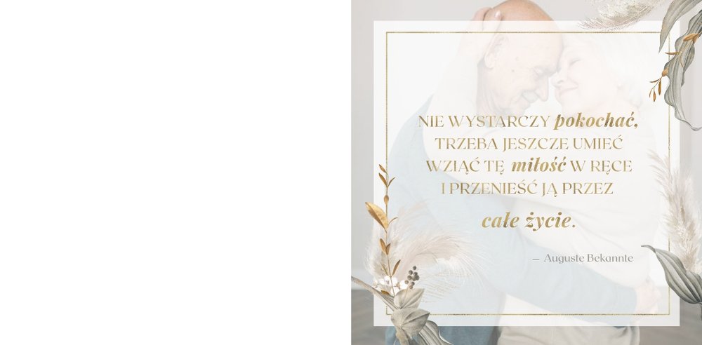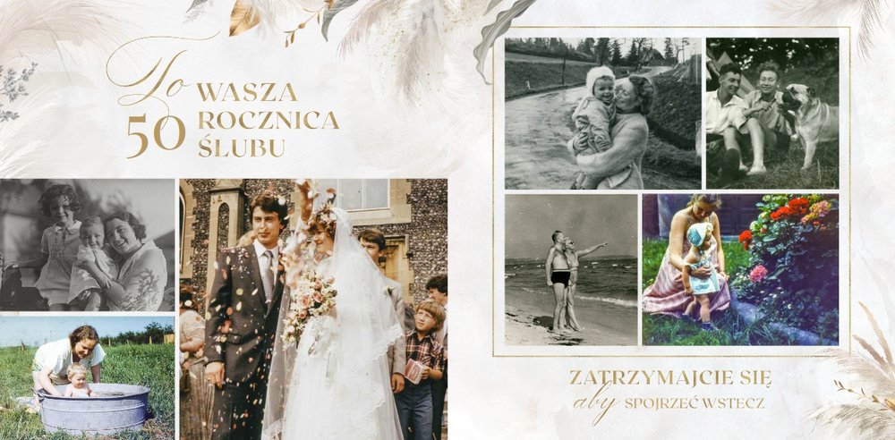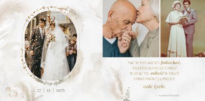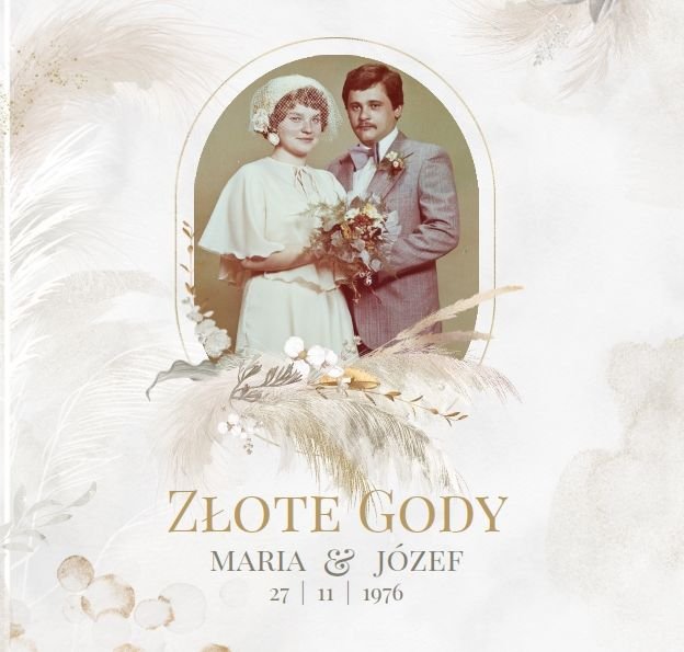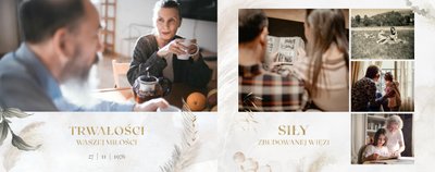 Fotoksiążka z szablonem "Złote gody" to wzruszający zbiór wspomnień, który przypomni o najpiękniejszych chwilach. Wystarczy, że wypełnisz komórki zdjęciowe obecnymi fotografiami najbliższych, ale i zeskanowanymi zdjęciami sprzed lat. Ich dopełnienie będą stanowić gotowe teksty, życzenia i sentencje, które z pewnością wywołają masę wzruszeń.