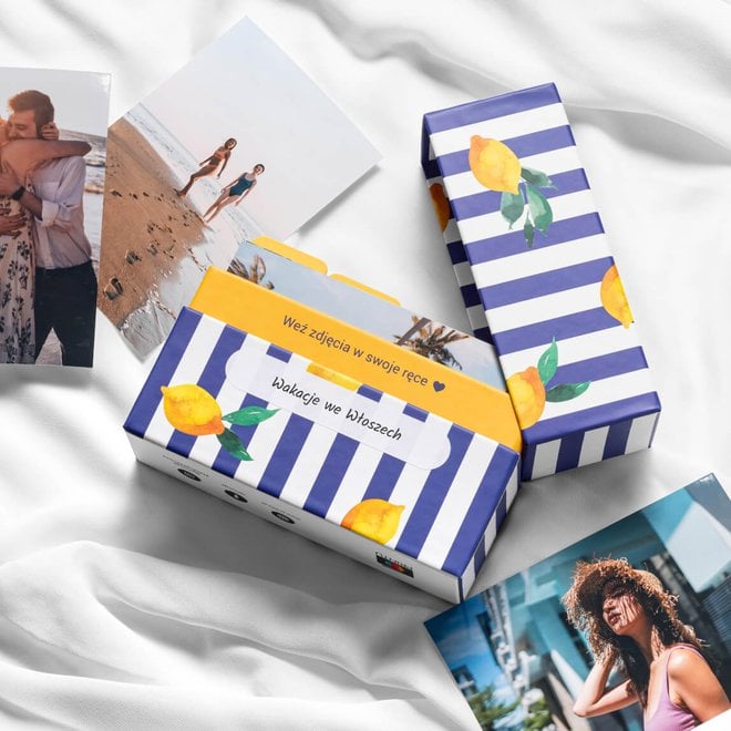 Zestaw z boxem zawiera 50 odbitek w rozmiarze 10x15 oraz jeden z dwóch dostępnych boxów.