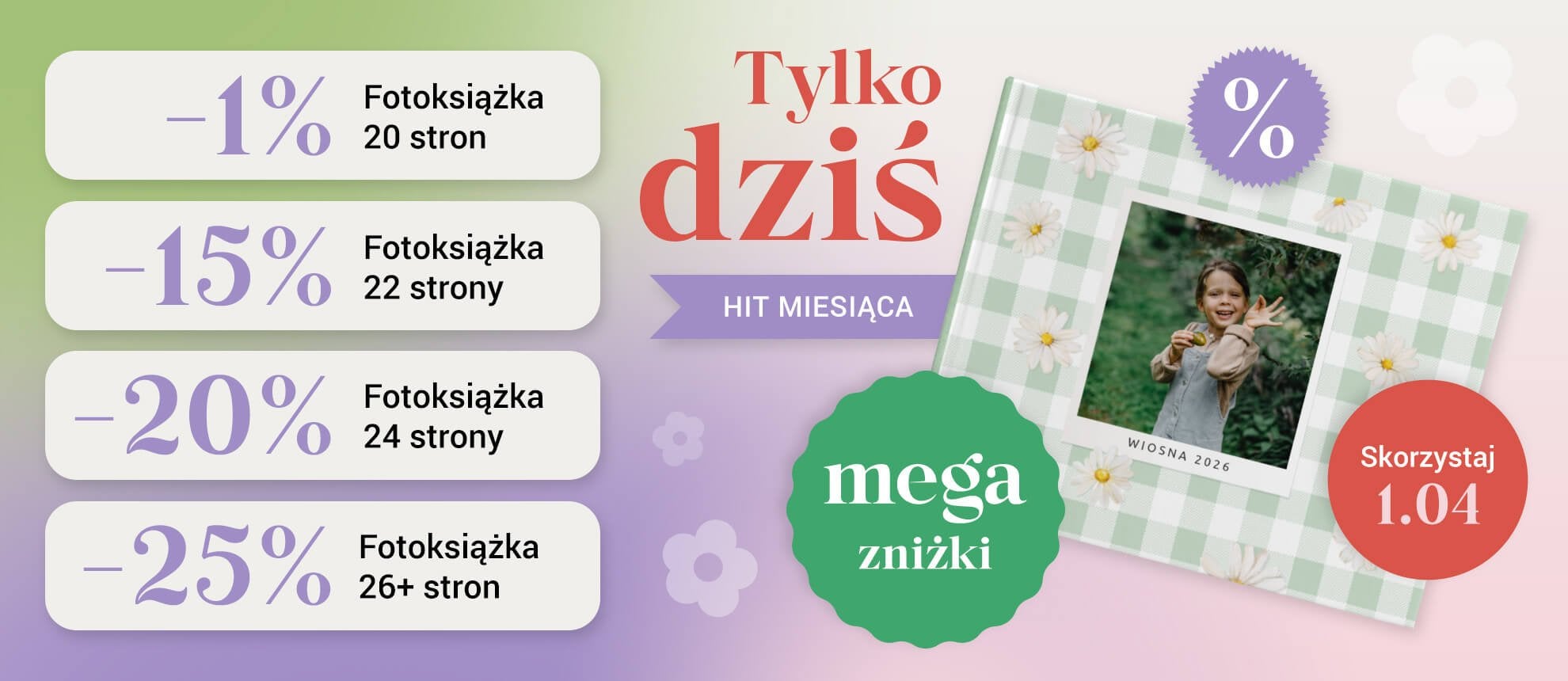 Użyj kodu PRIMA4 i złóż zamówienie do 01.04, a otrzymasz do 25% zniżki na fotoksiążki, według warunków dostępnych na górze strony.
